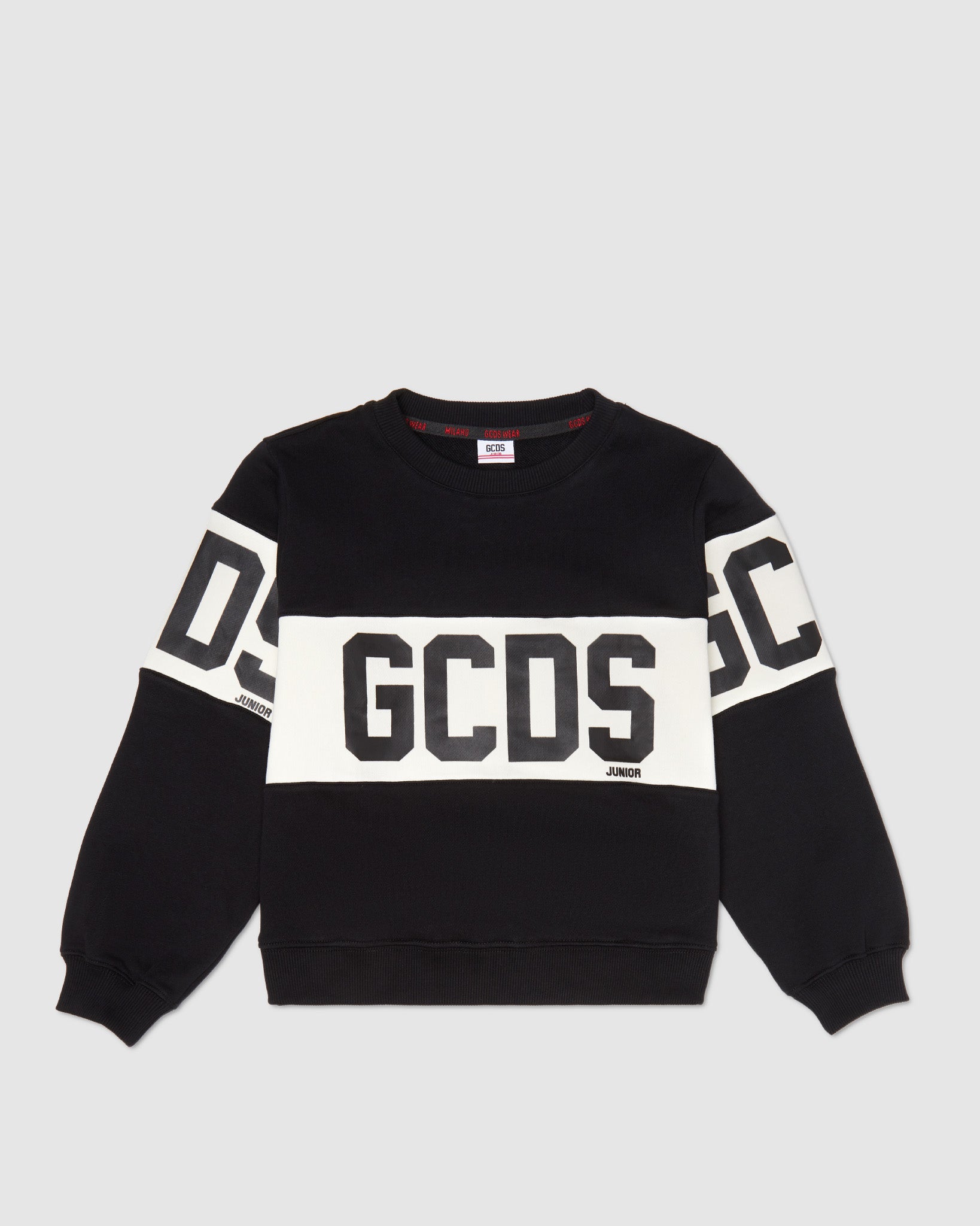 Cotton crewneck sweatshirt featuring the classic GCDS logo band inlaid in contrast and applied on the front and back. Ribbed cuffed hems.
