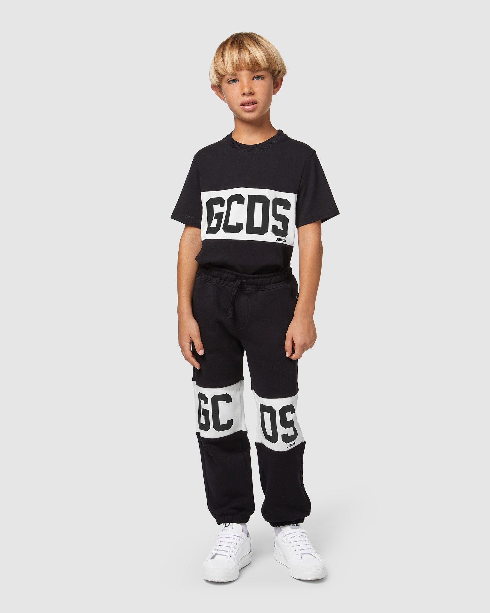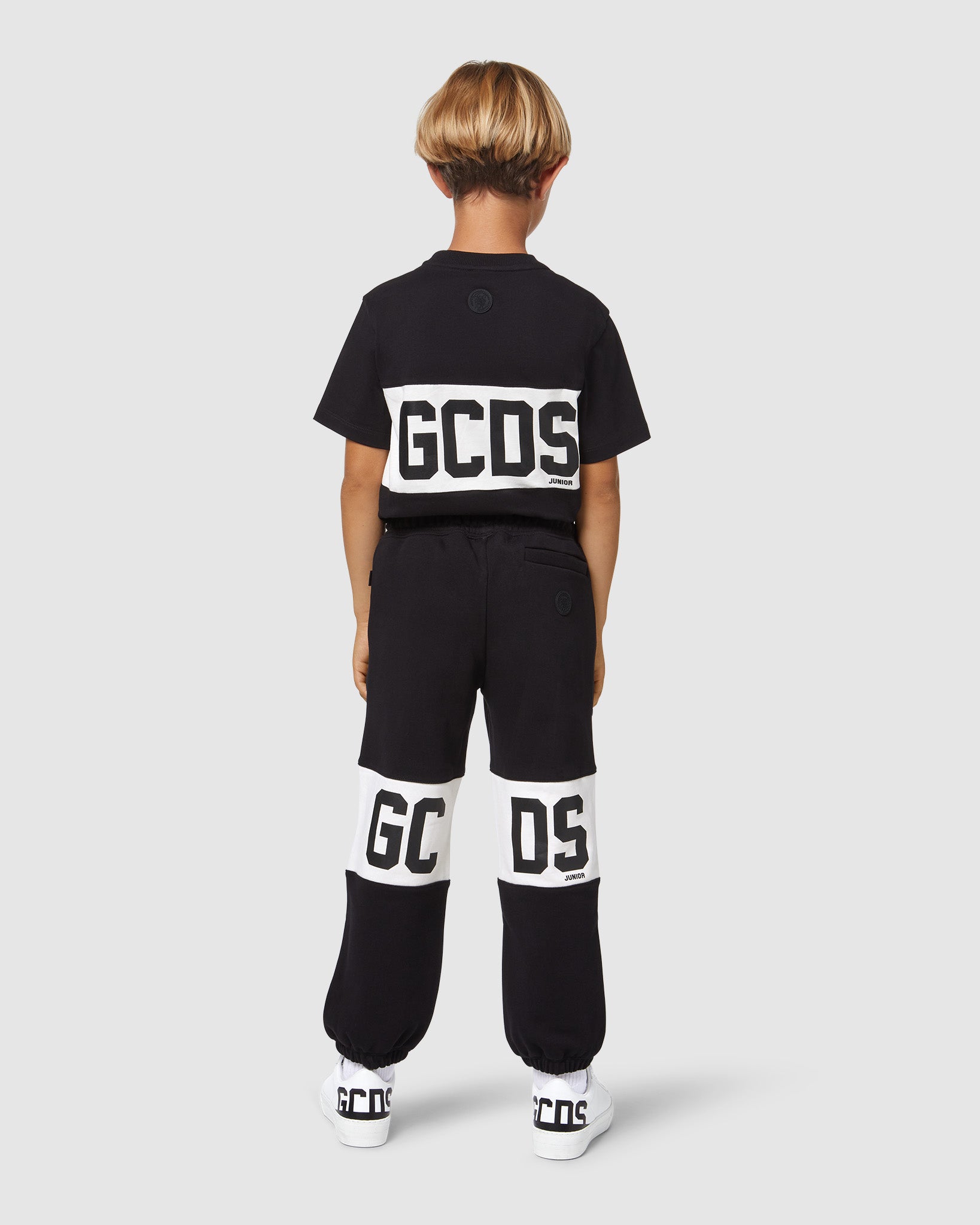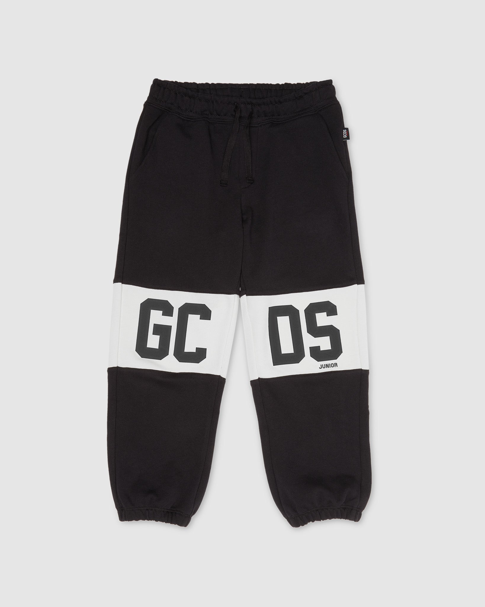 Cotton sweatpants with elasticized waistband and adjustable front ties. Featuring the classic GCDS logo band inlaid in contrast. Front and back patch pockets and cuffed hem.