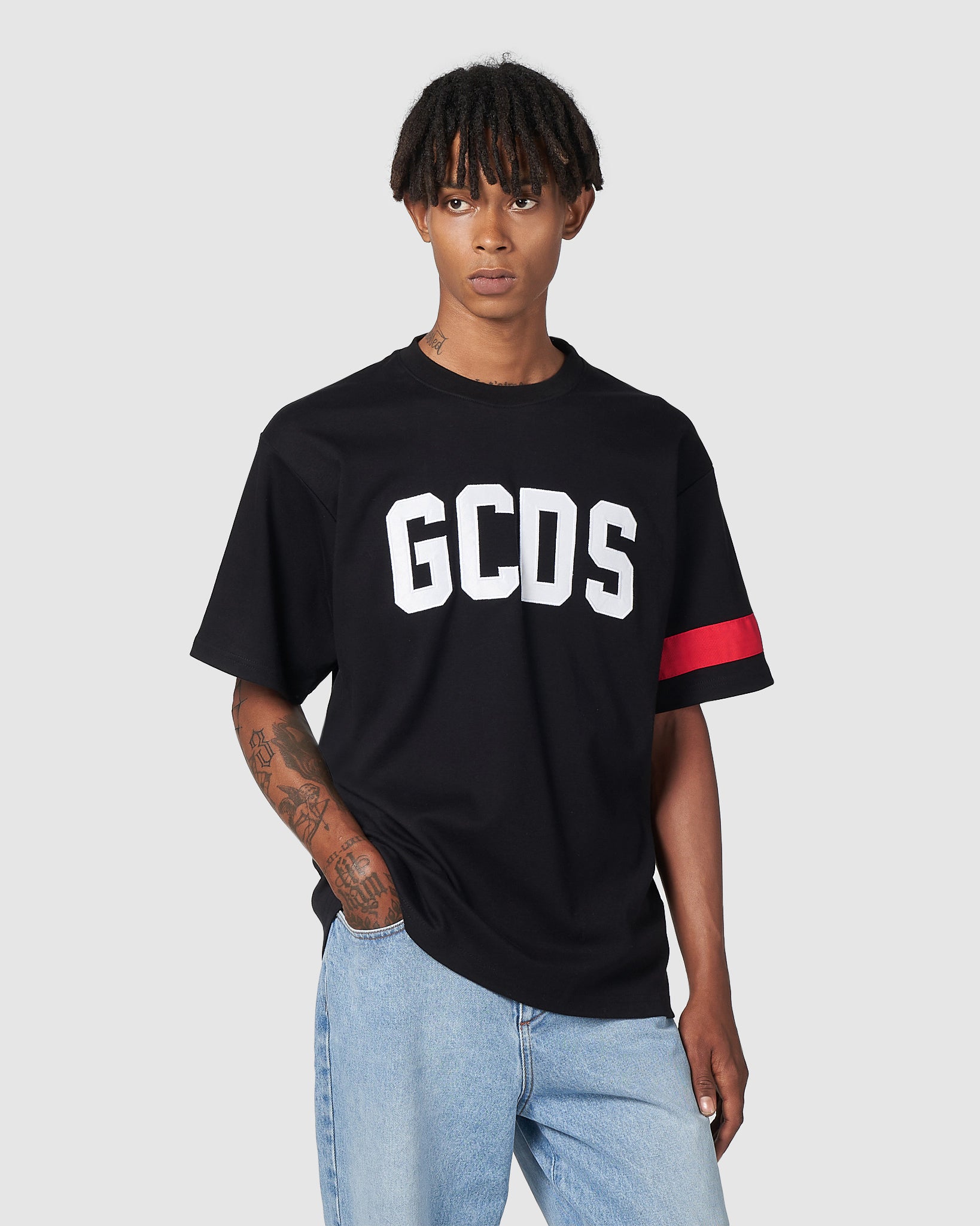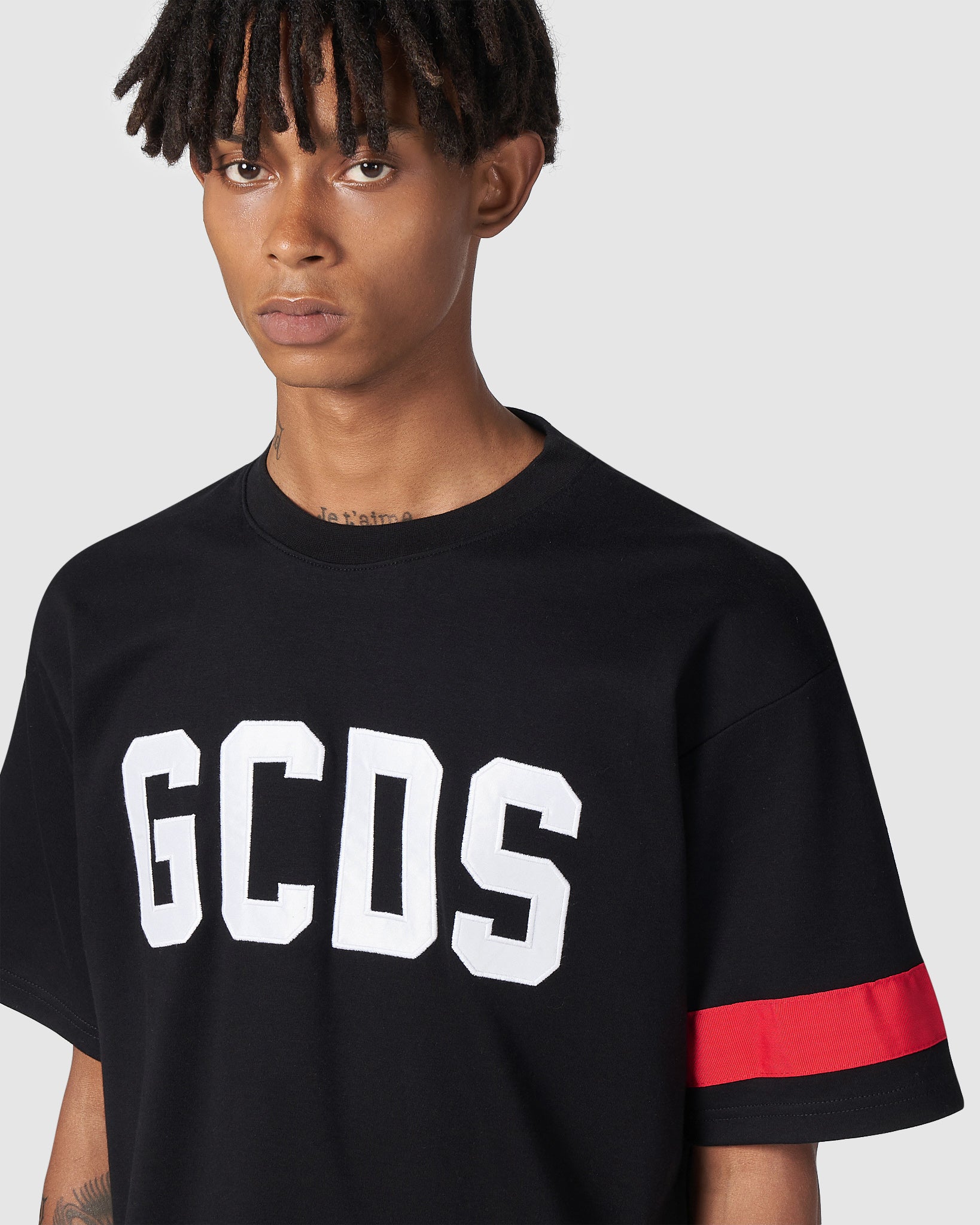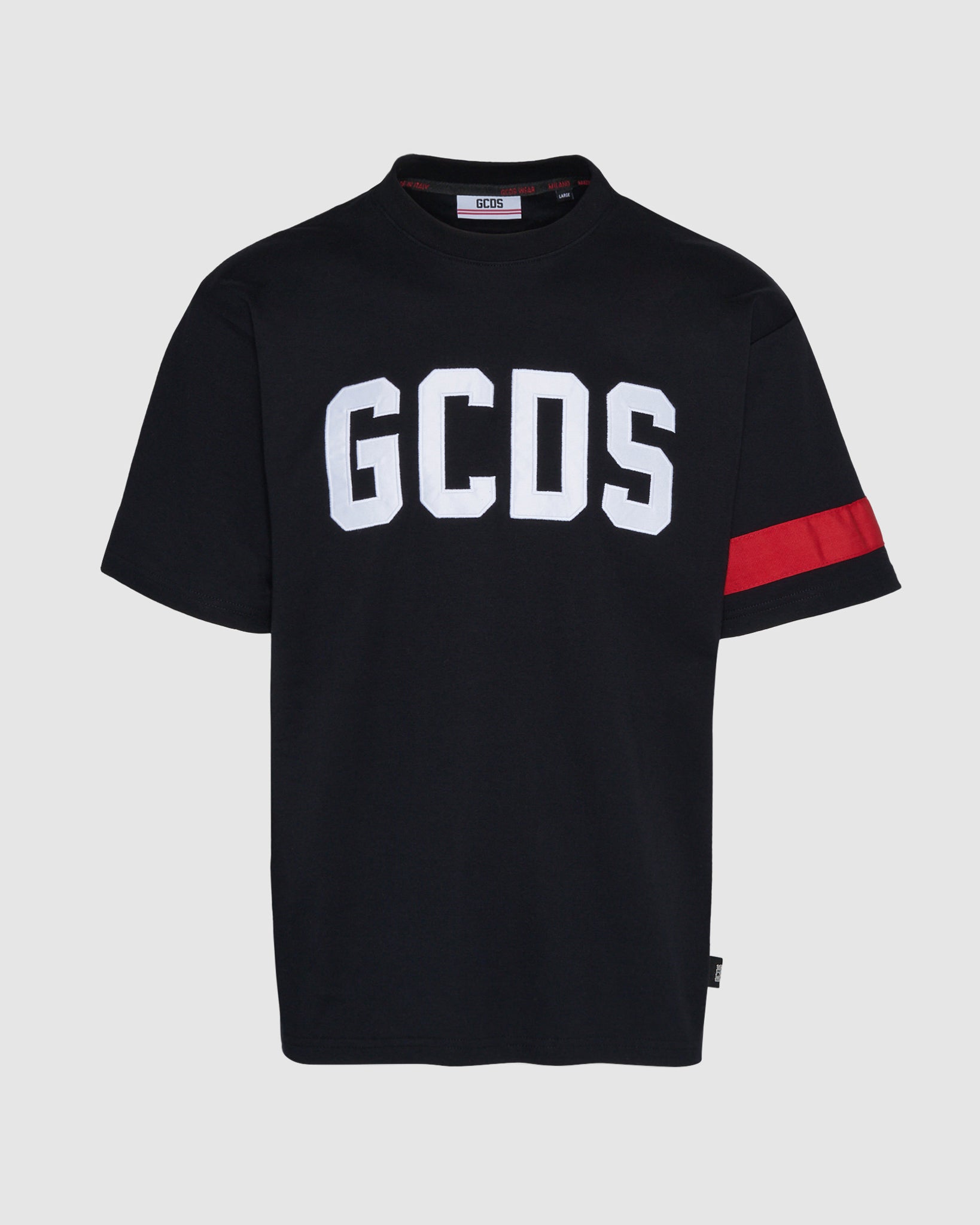 Cotton GCDS T-shirt with logo embroidered in cording on the front and grosgrain band on the left sleeve. Embroidery on the back. Classic cut, regular fit.