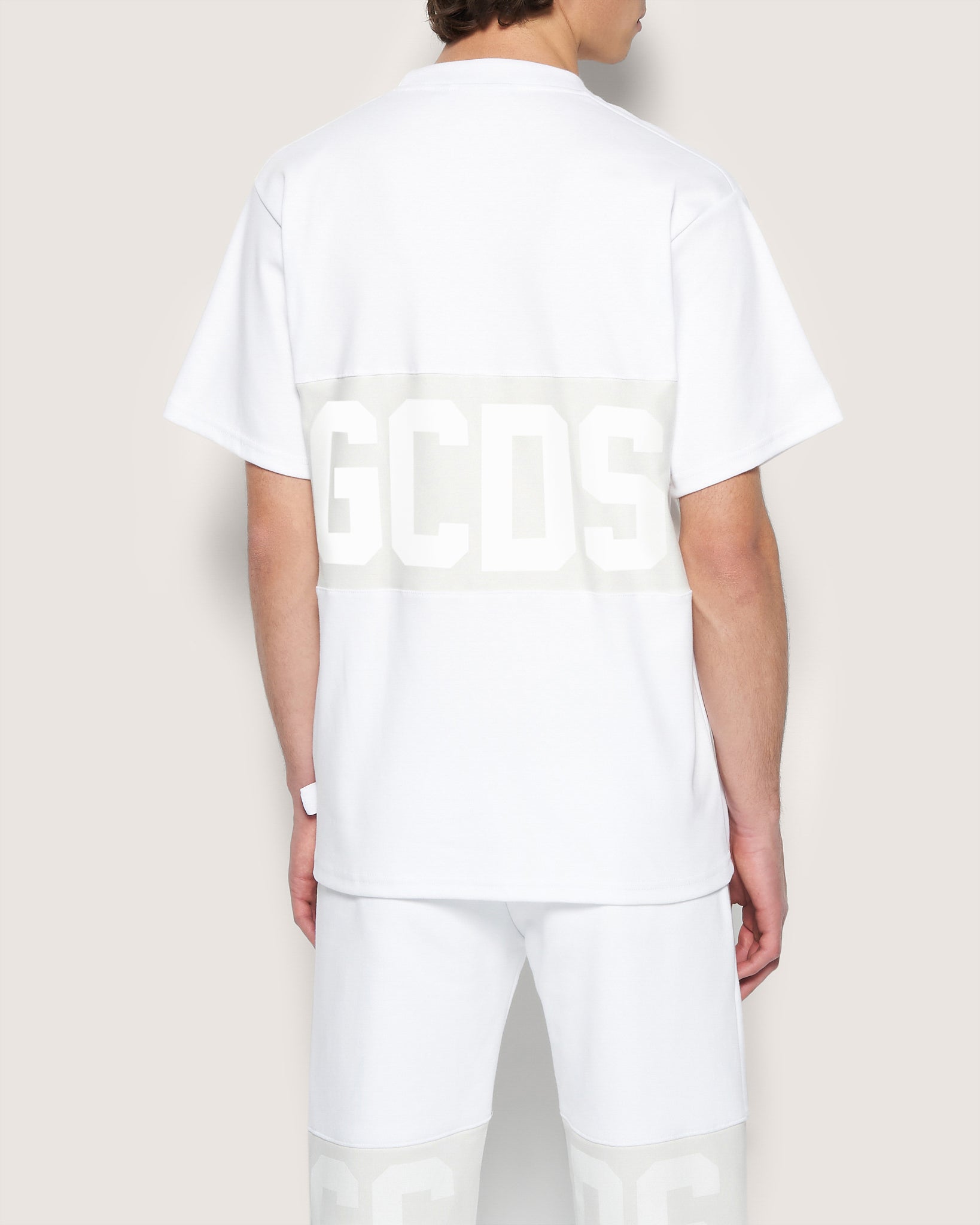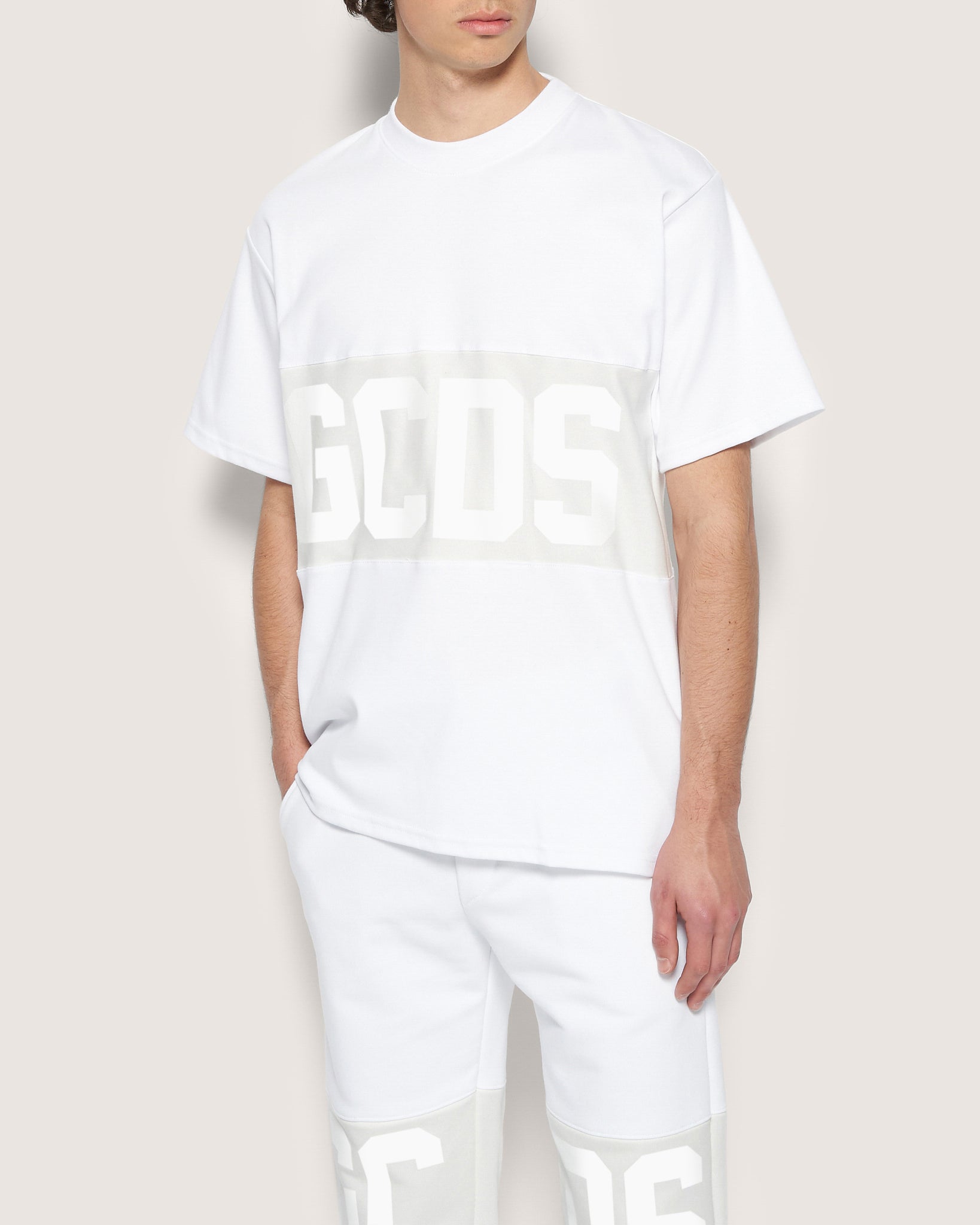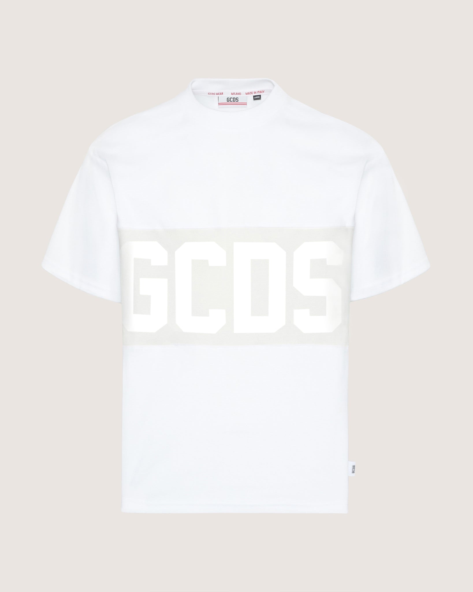 Cotton GCDS T-shirt with tone-on-tone inlaid logo band, silkscreen print, front and back. Classic cut, regular fit.