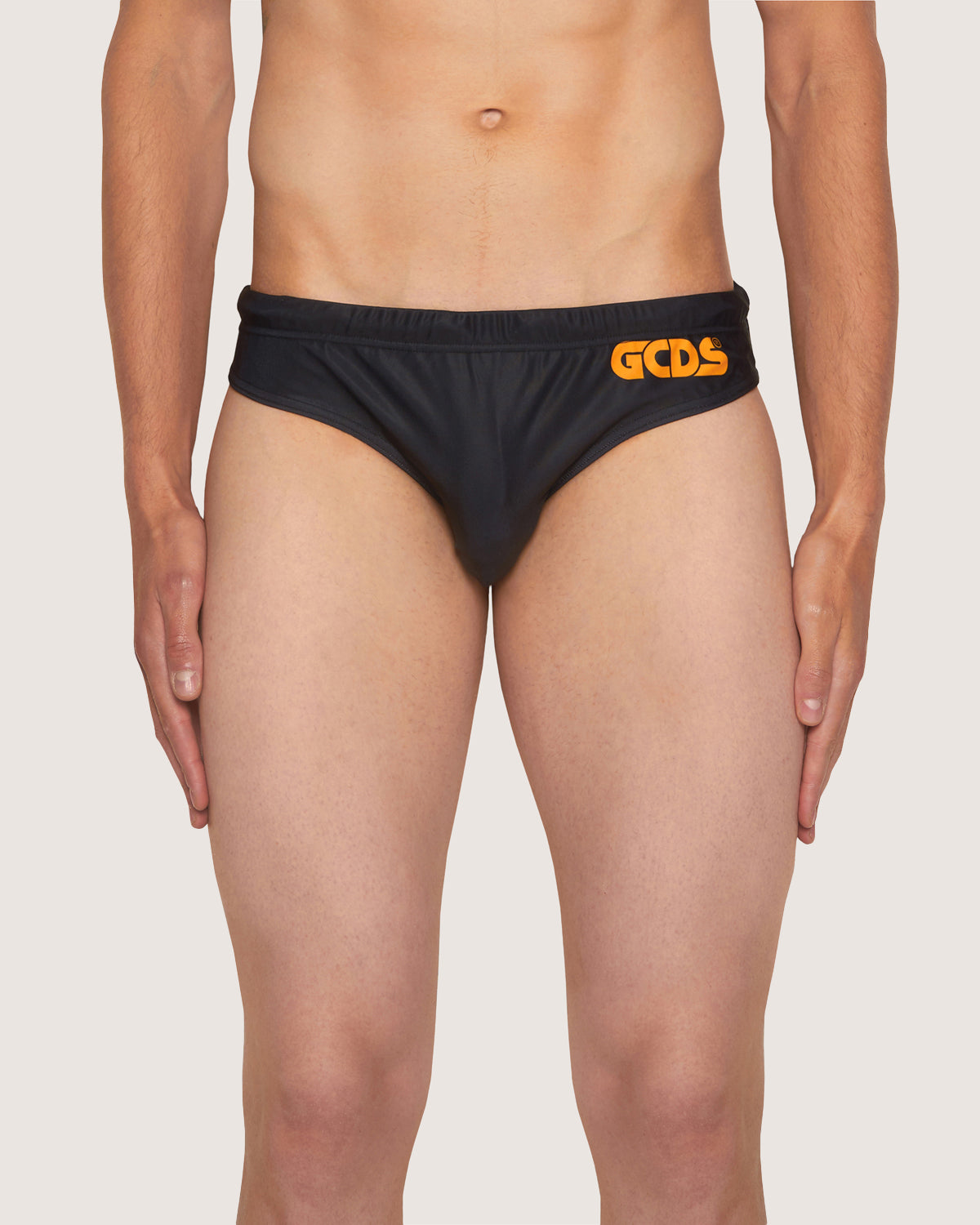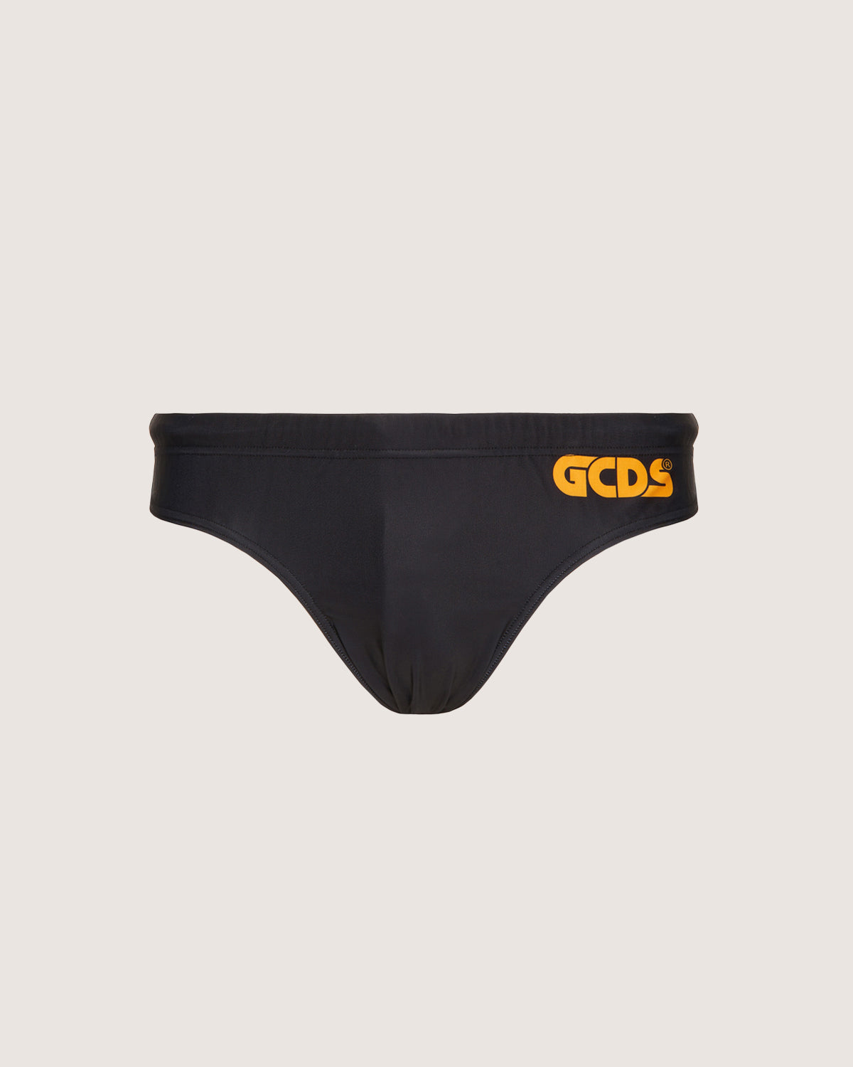 Beach briefs with GCDS printed logo on front and back.
