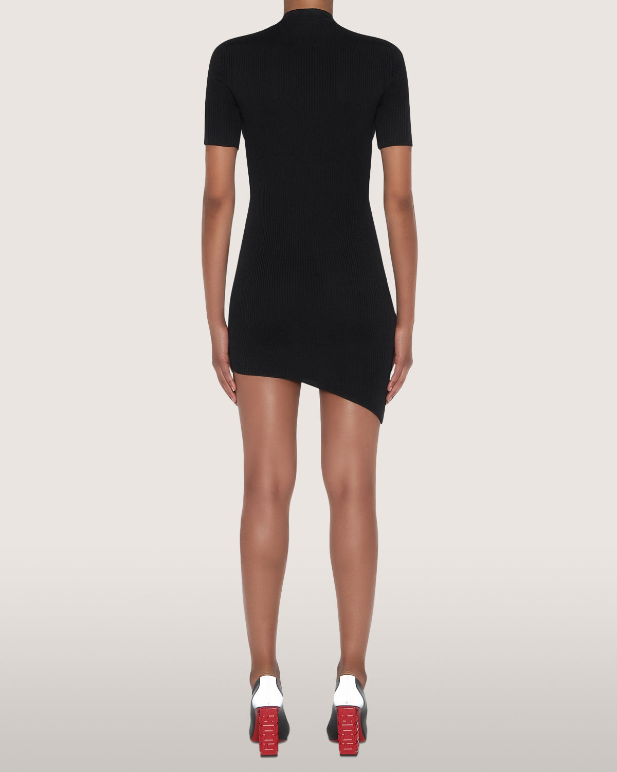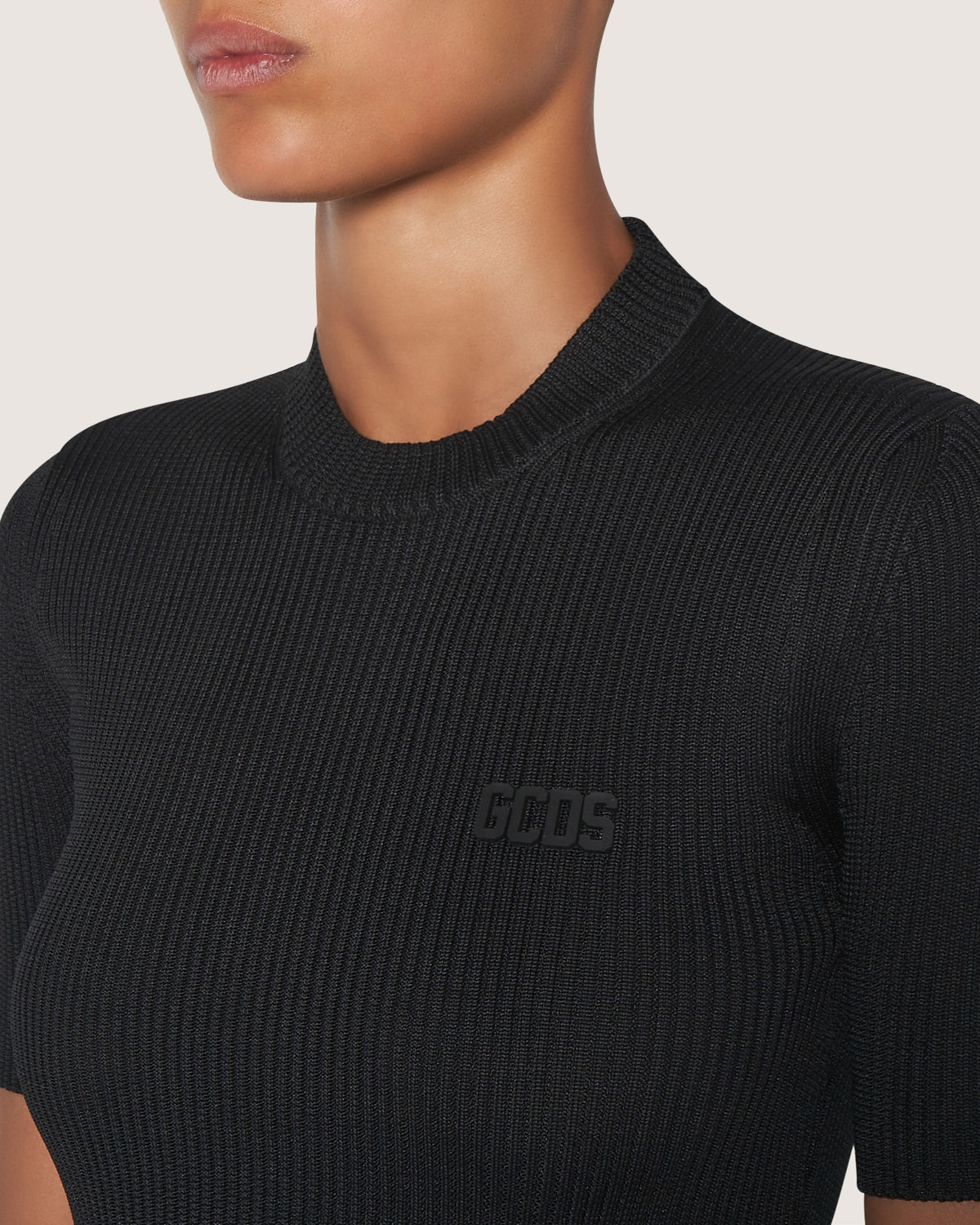 Ribbed dress with short sleeves, asymmetrical cut and zipper with logoed direct on the bottom. Rubberized GCDS logo patch applied to the pocket.