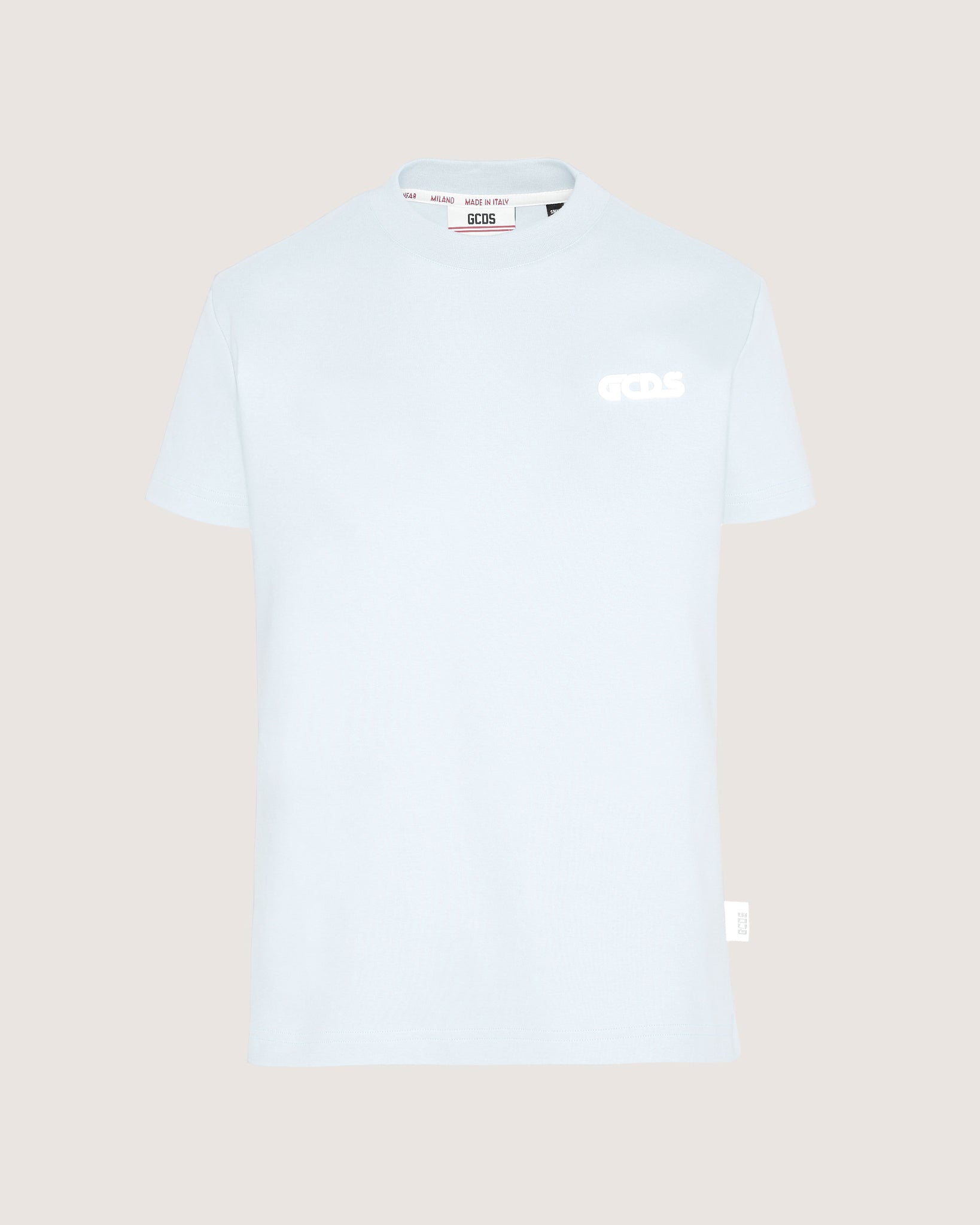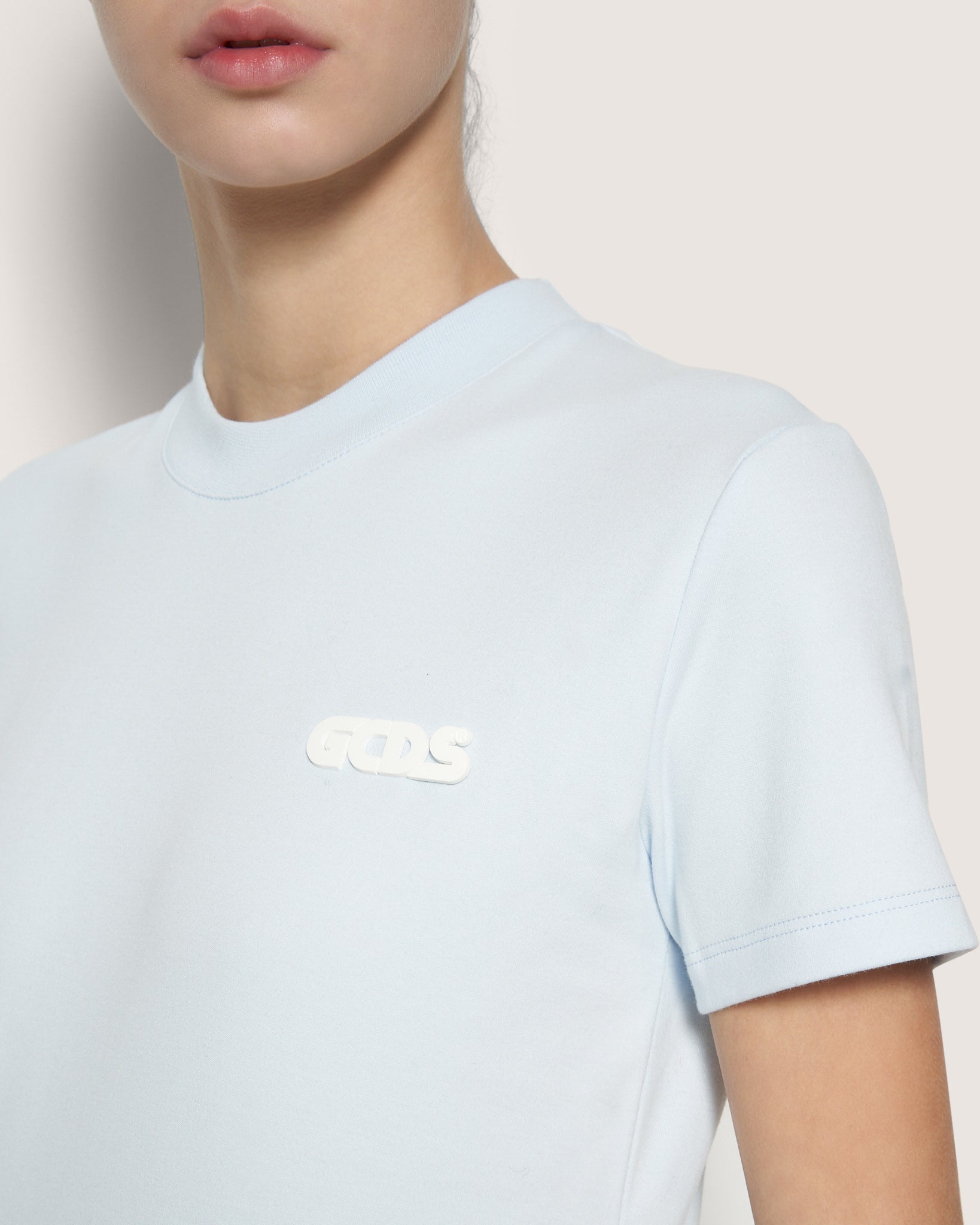 Cotton GCDS T-shirt, wide ribbed neckline, characteristic of GCDS garments. Roundy logo patch on the front, at pocket height. Slightly fitted for a slim fit, flattering to the body.