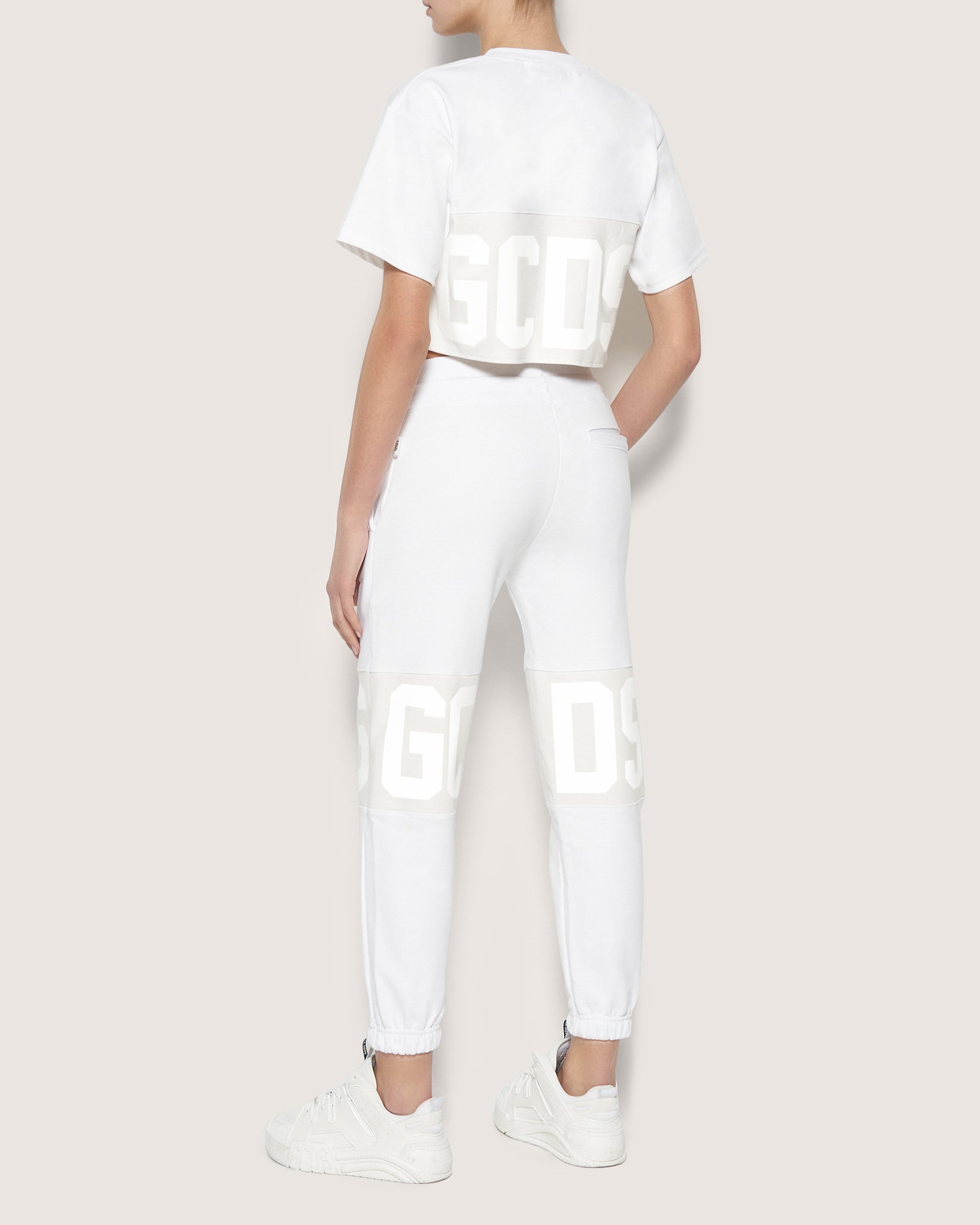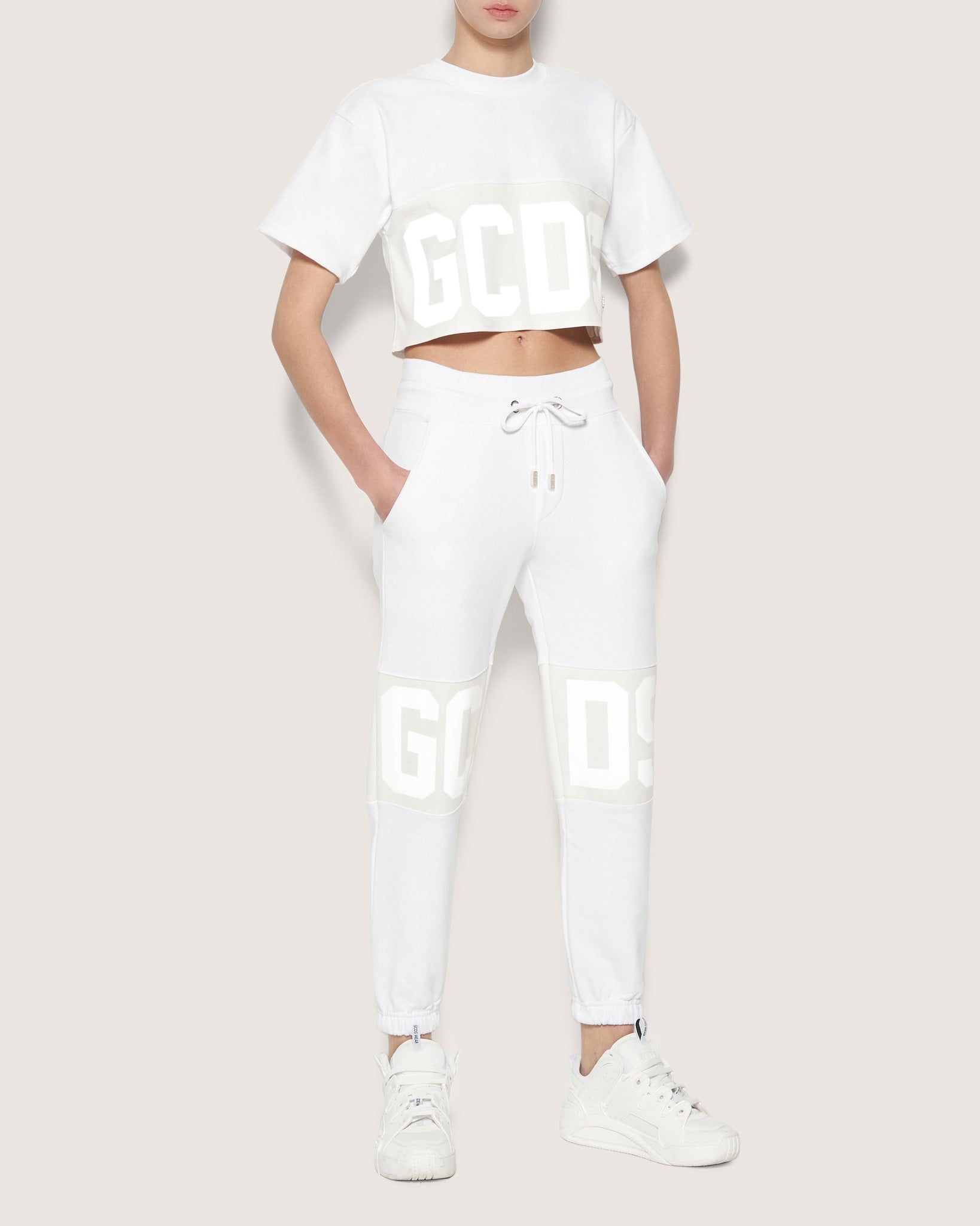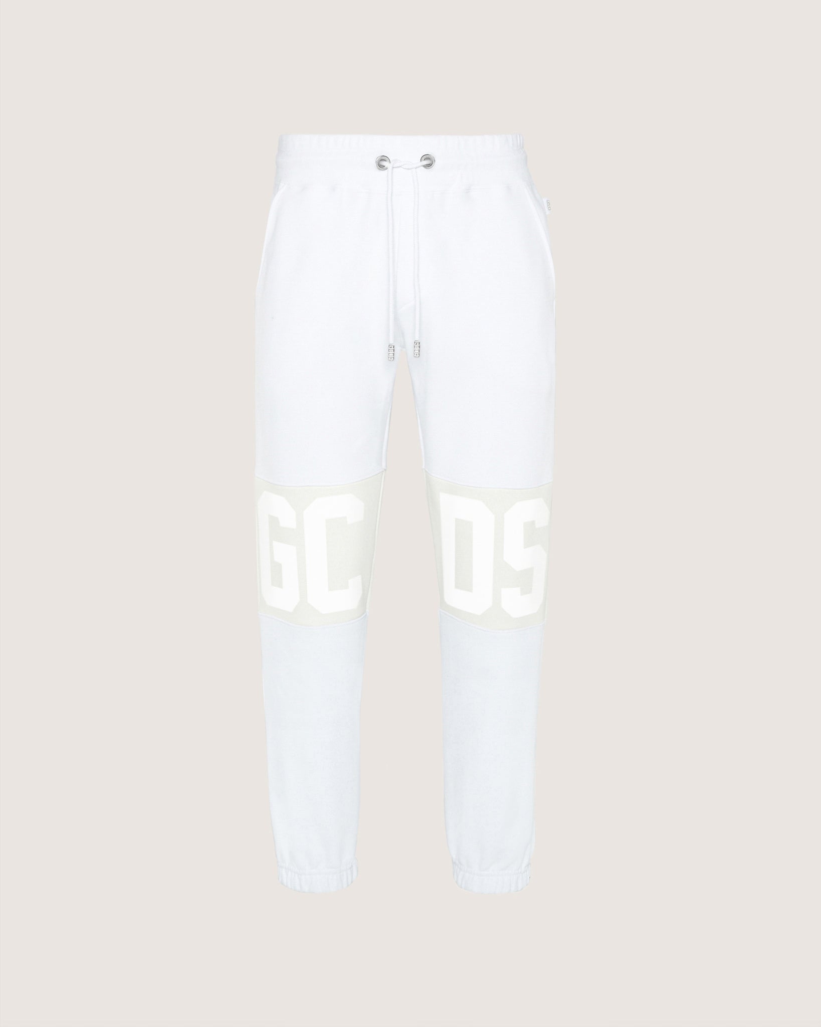 Cotton GCDS sweatpants with tone-on-tone inlaid logo band at knee height at front and back. Slash pockets, elastic waistband and leg bottoms. Regular fit, tapered leg cut.