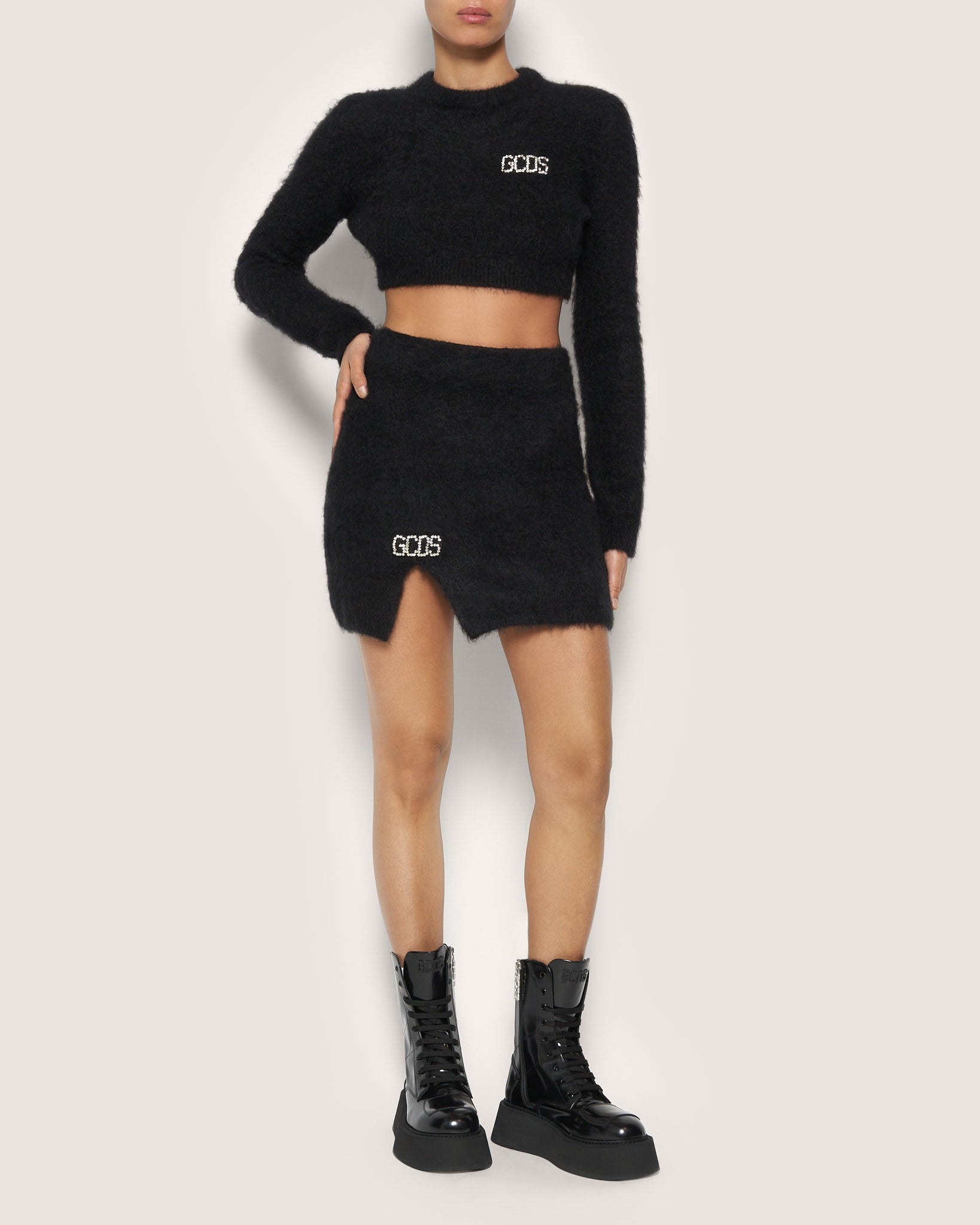 High-waisted GCDS mohair mini skirt. Above the slit, logo patch in Preciosa crystals. Available in collection colors.