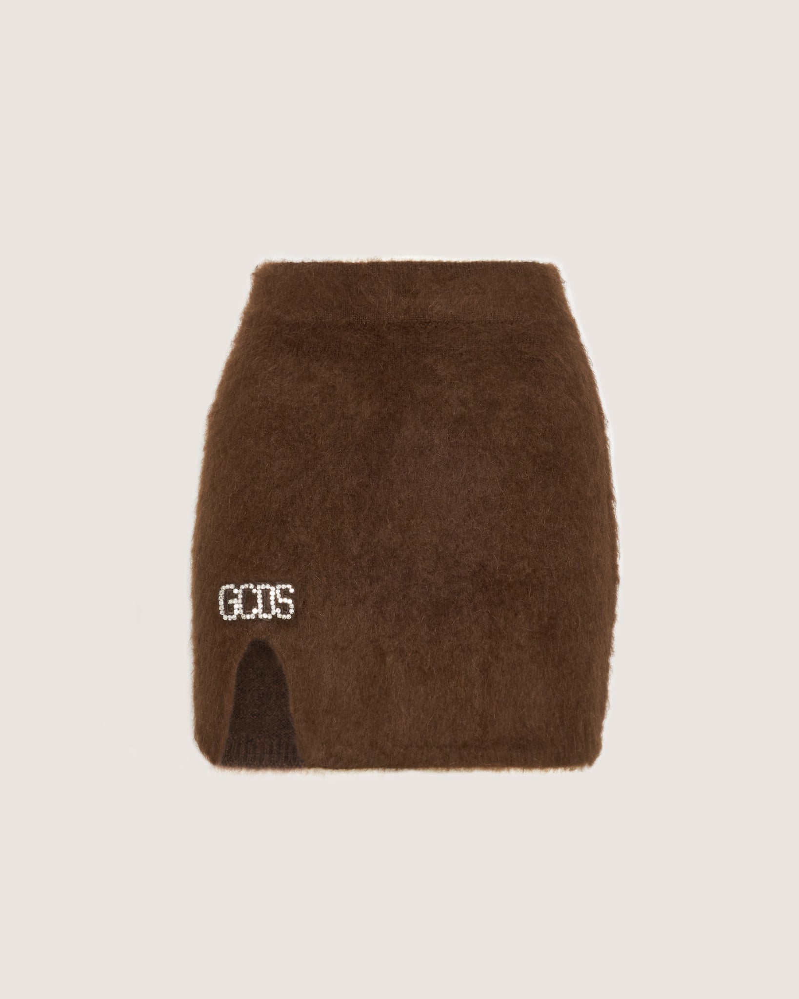 High-waisted GCDS mohair mini skirt. Above the slit, logo patch in Preciosa crystals. Available in collection colors.