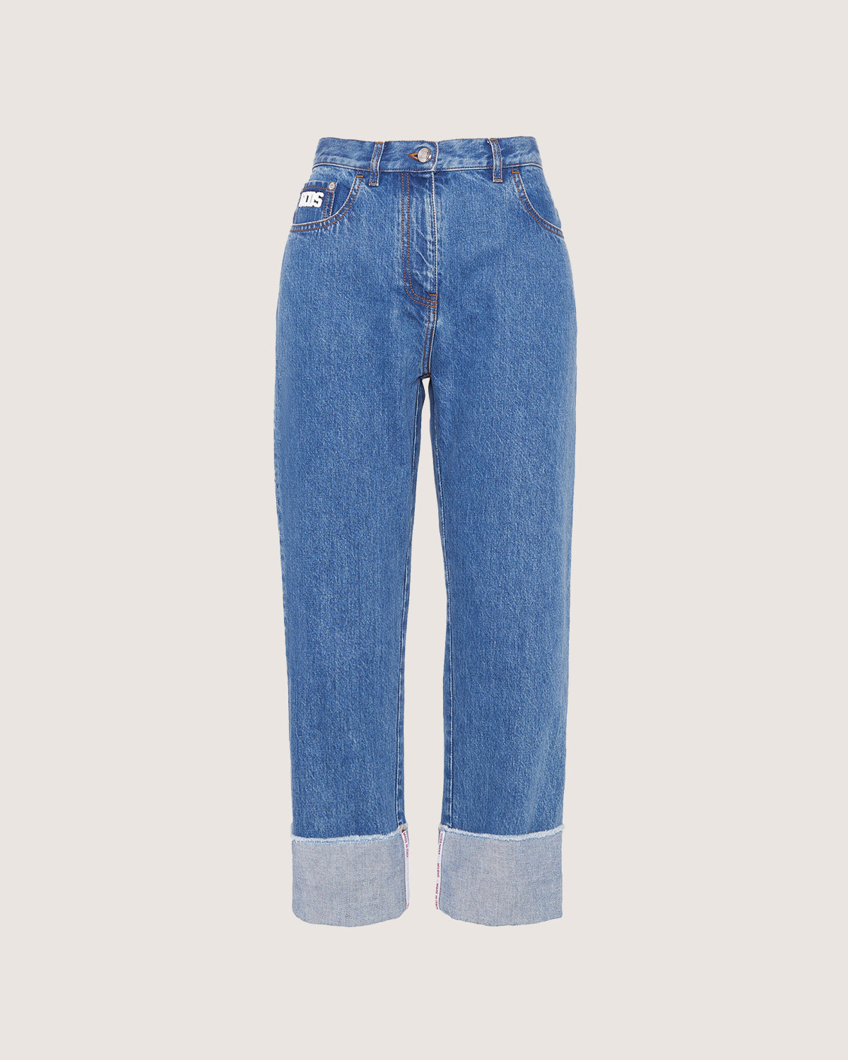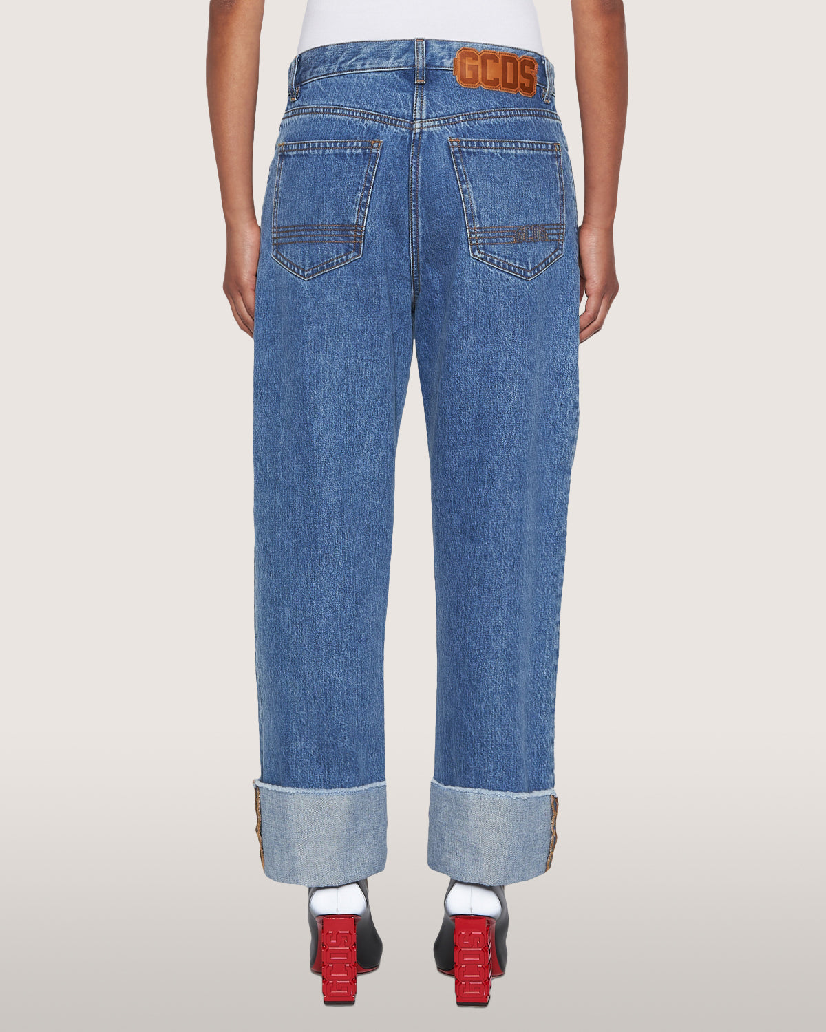 Low-waisted boyfriend cut jeans with high turn-ups at the bottom.