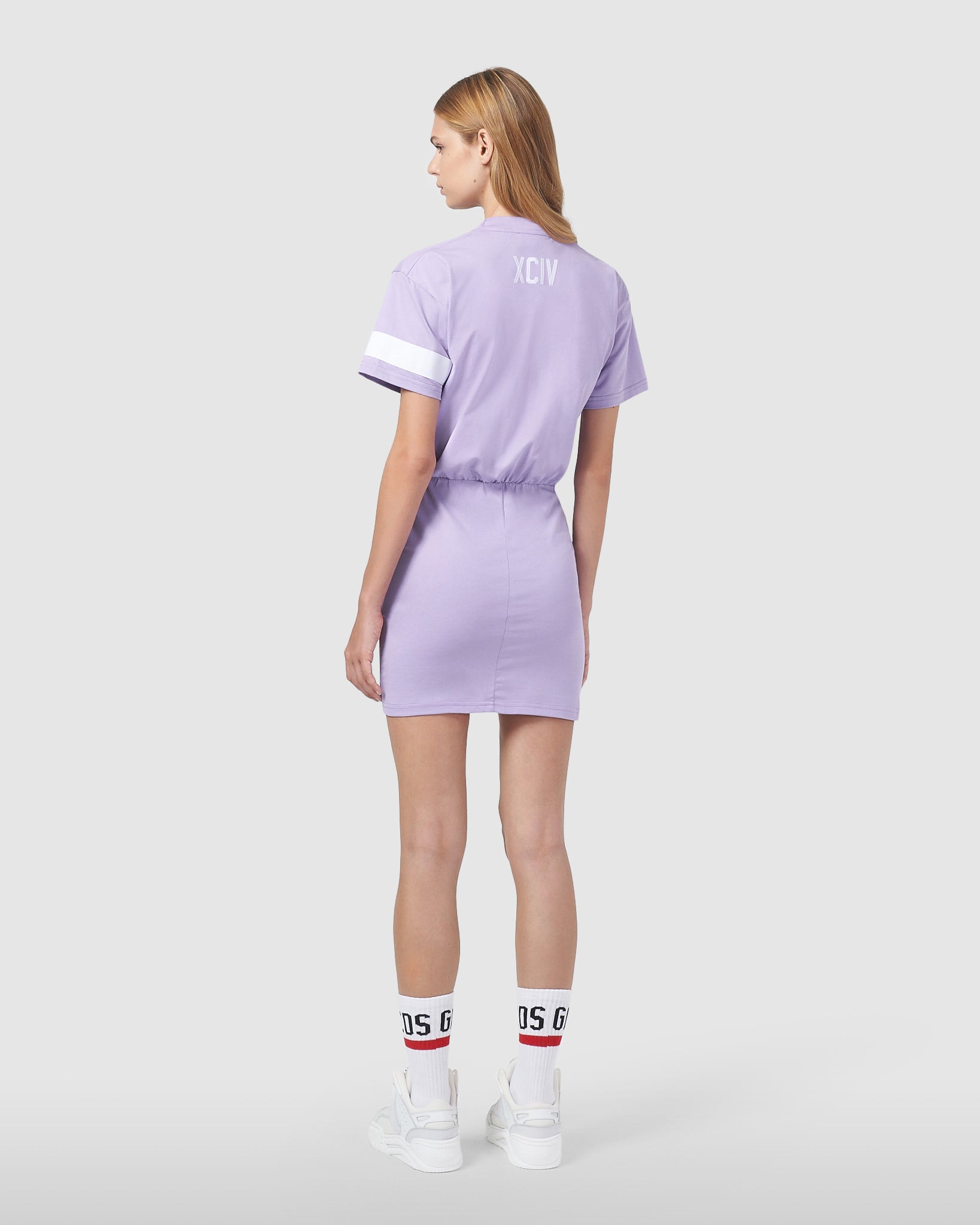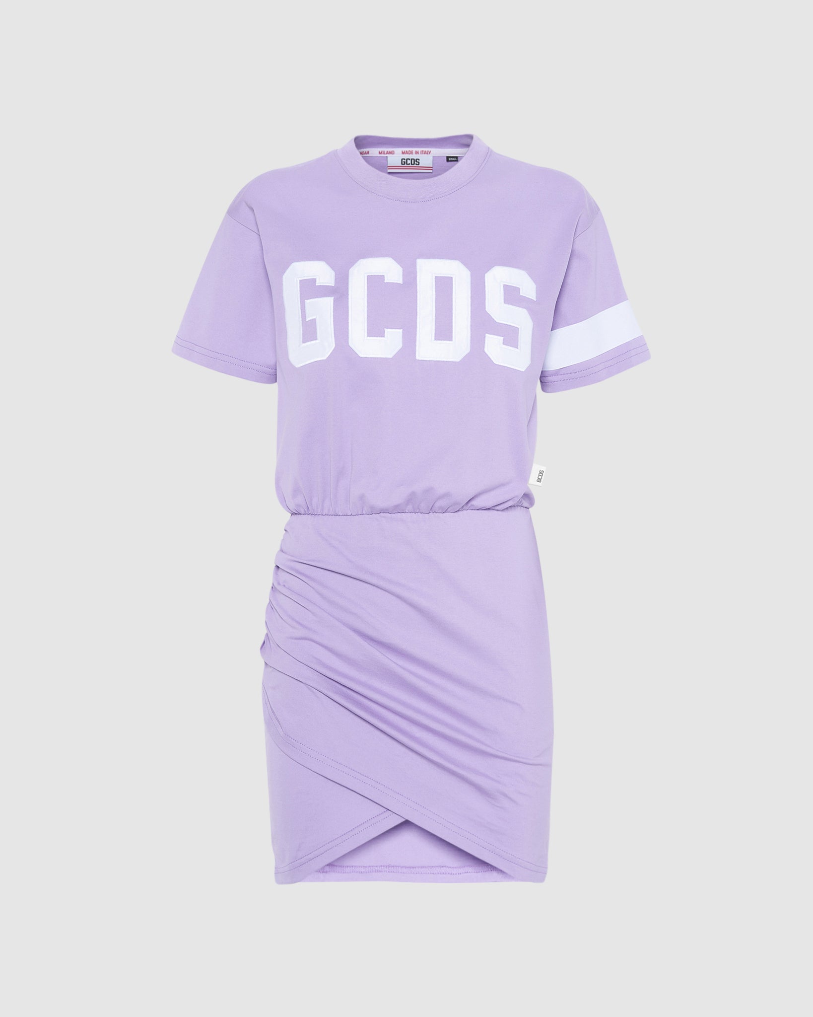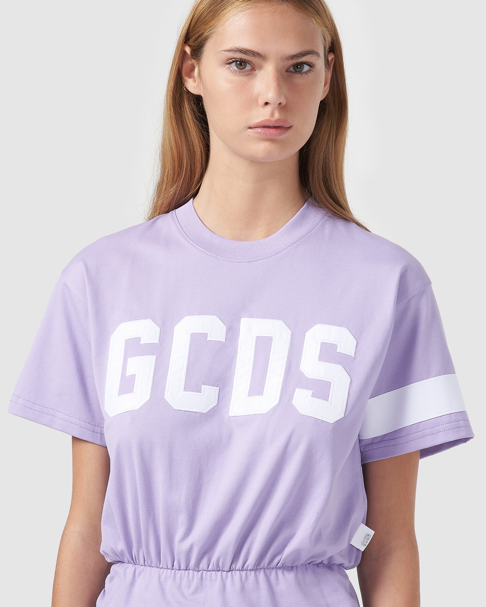 GCDS cotton dress made from a regular fit T-shirt with contrasting satin logo appliquéd with cording on the front. Contrasting grosgrain band appliquéd on the left sleeve and embroidery on the center back. Cut at the waist where the wrap draped skirt comes together.