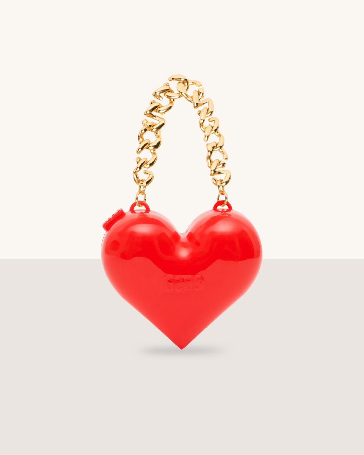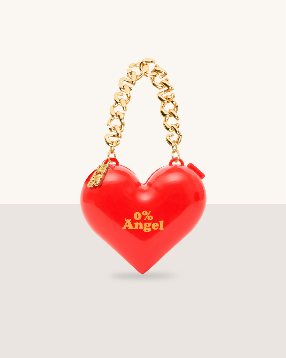 Heart-shaped handbag with 0% Angel print and shiny gold logoed GCDS chain.