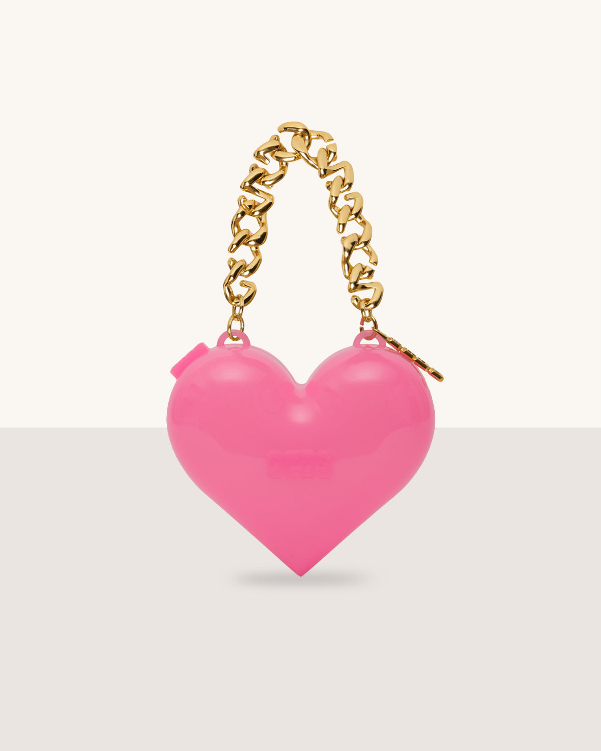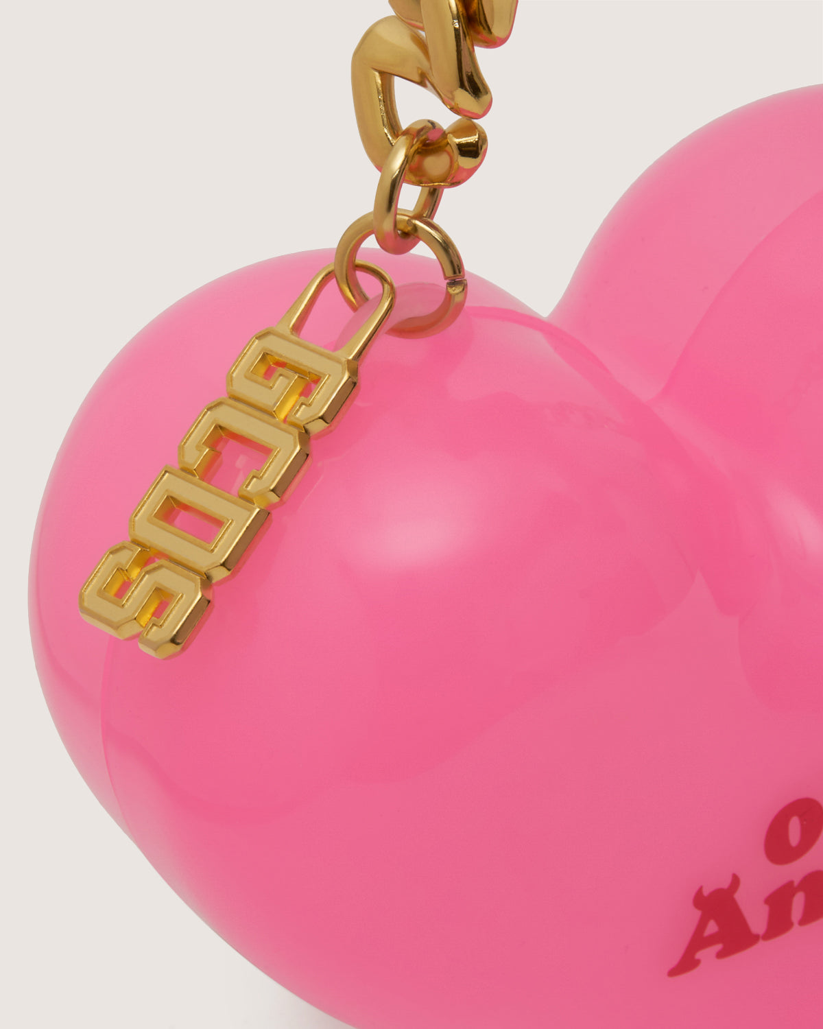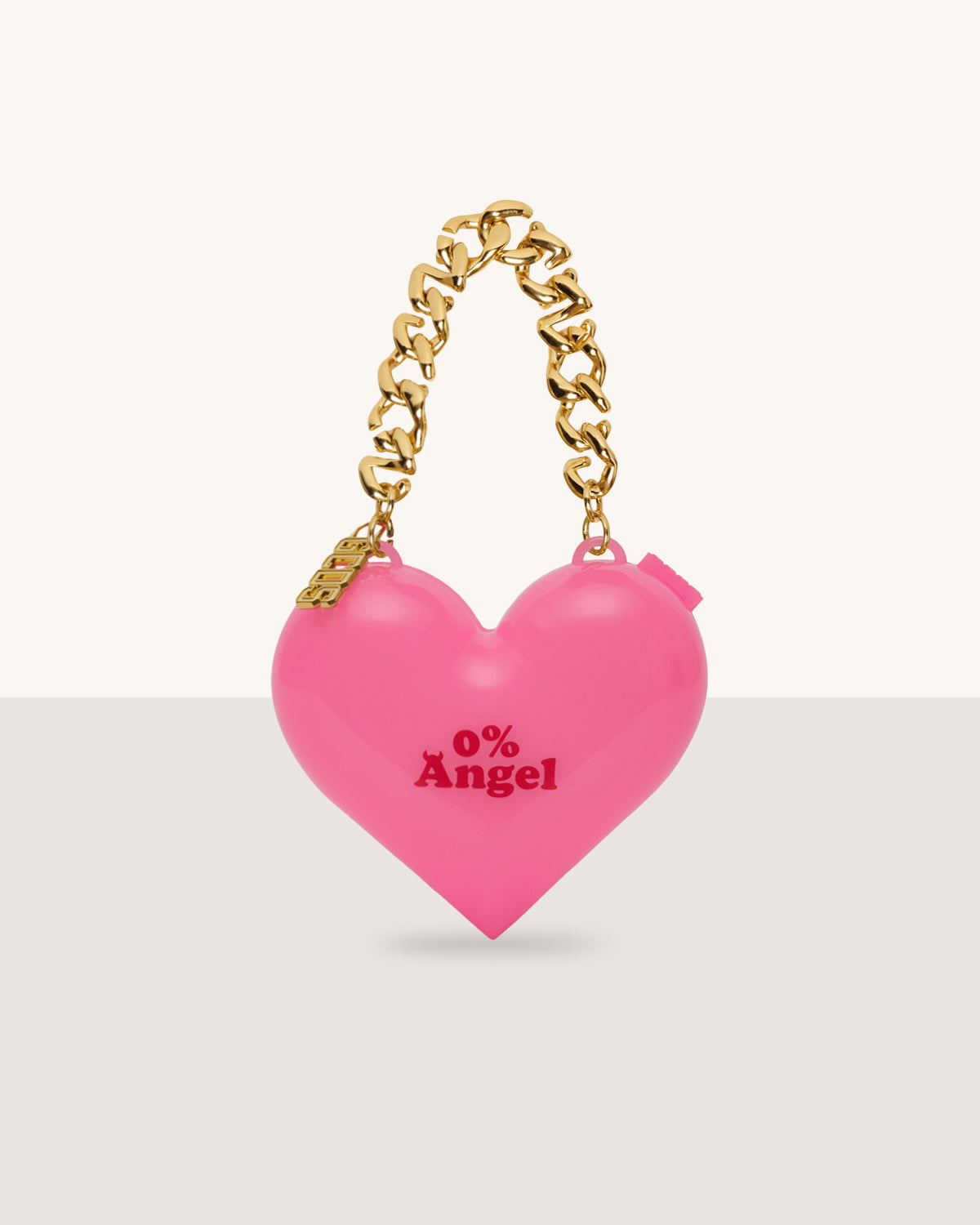 Heart-shaped handbag with 0% Angel print and shiny gold logoed GCDS chain.