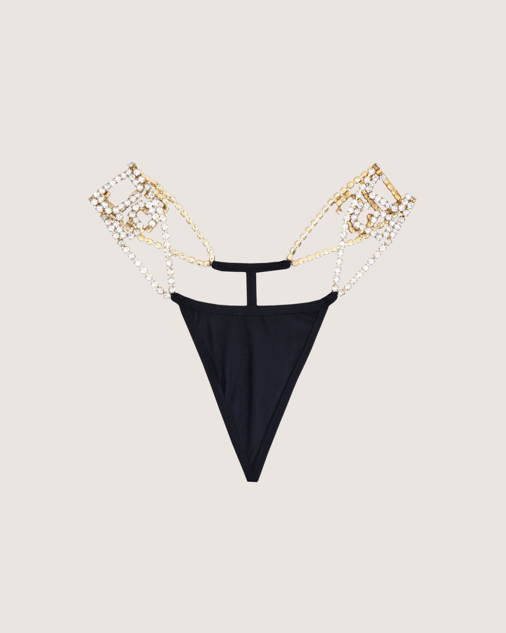 Stretch Lycra GCDS thong, with Preciosa crystals logo jewel chain on sides.