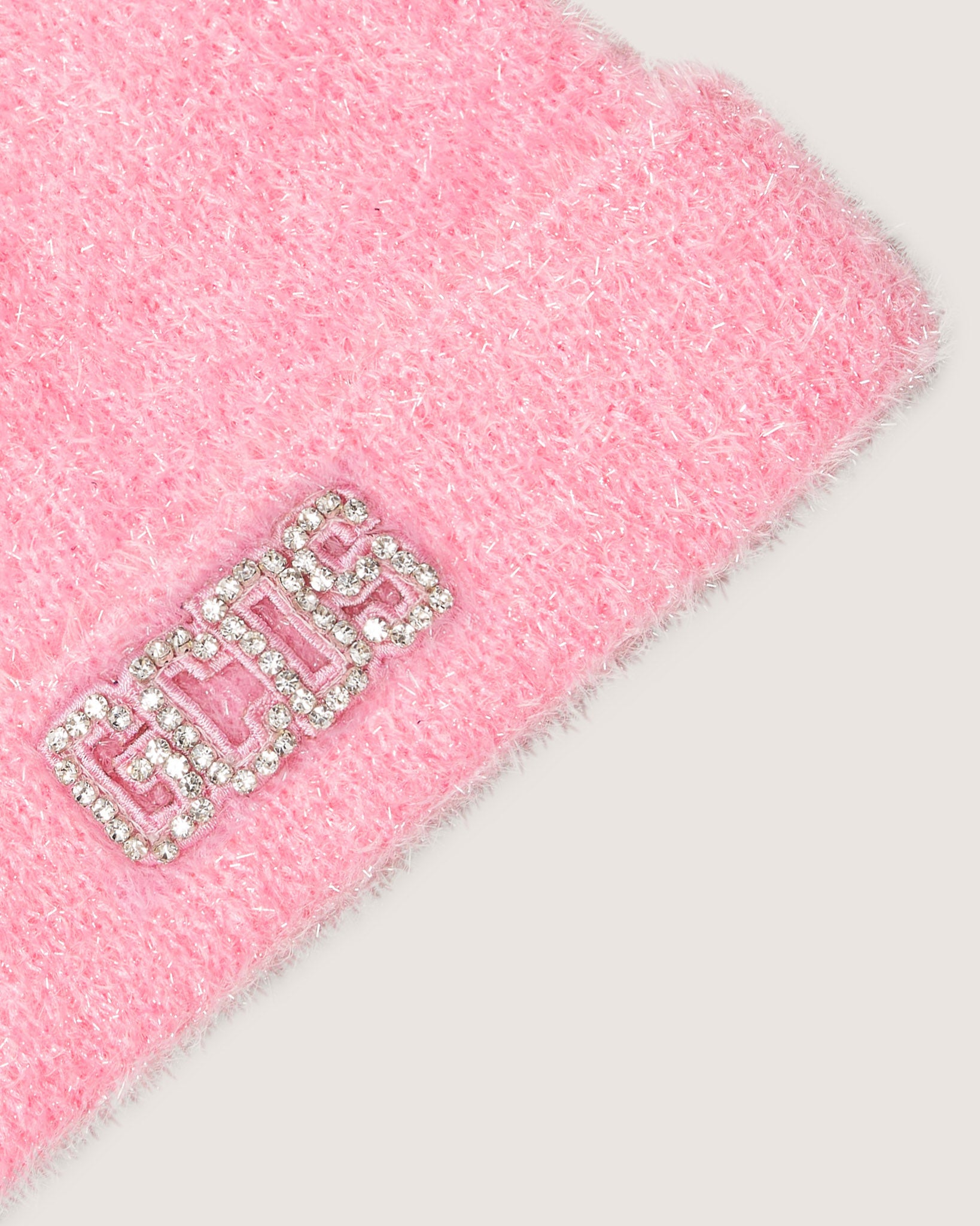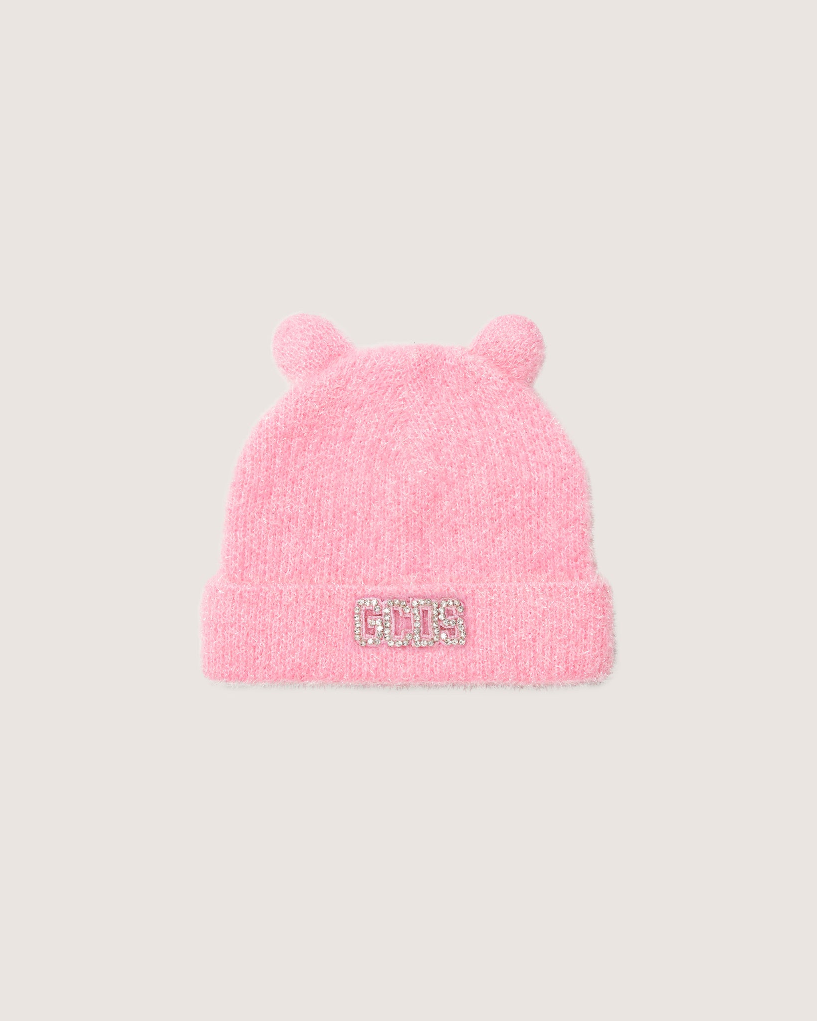 Glittery yarn knitted GCDS beanie with ears. GCDS rhinestone logo patch on the front.