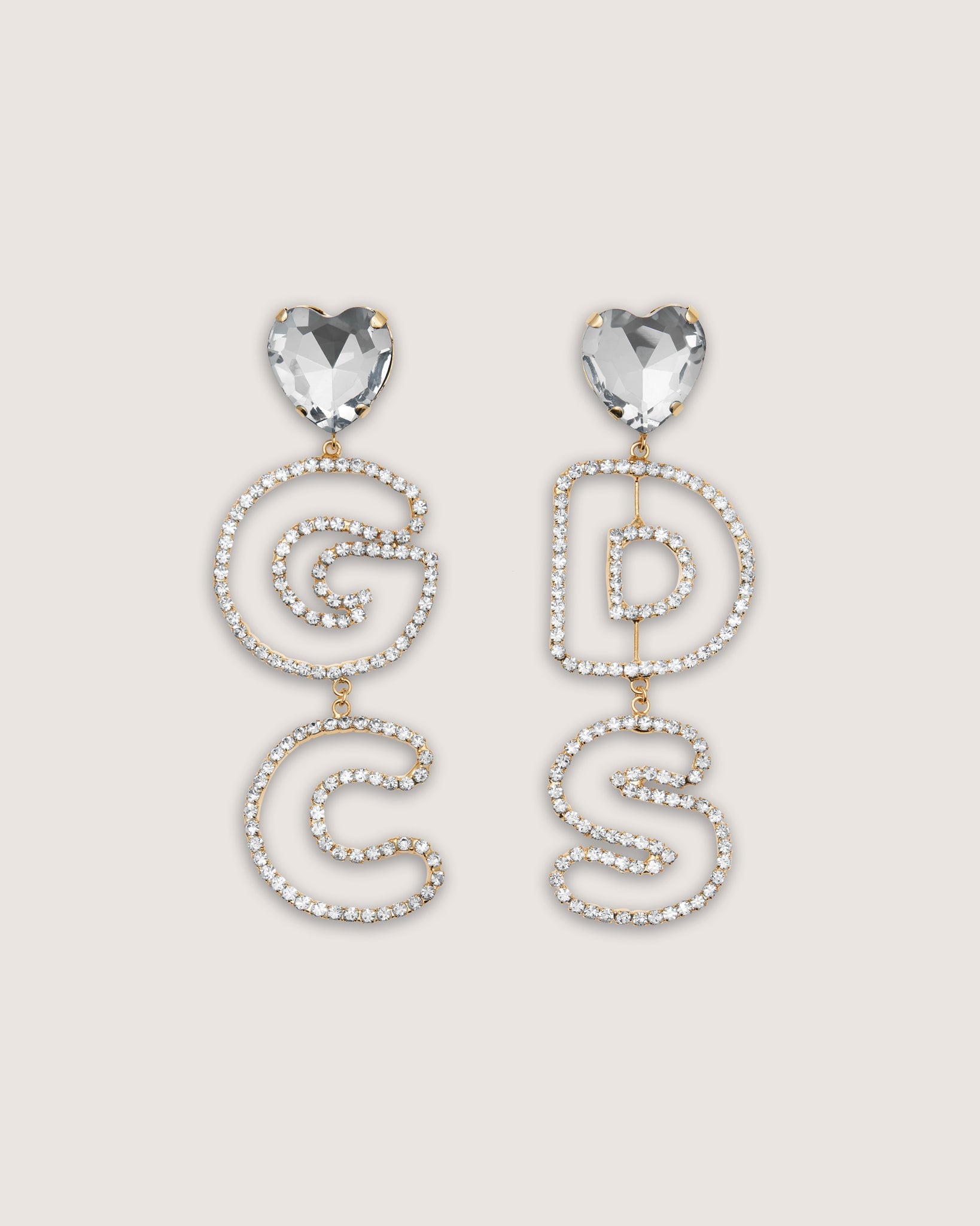 Maxi GCDS earrings with Preciosa crystal heart and GCDS Cute logo.