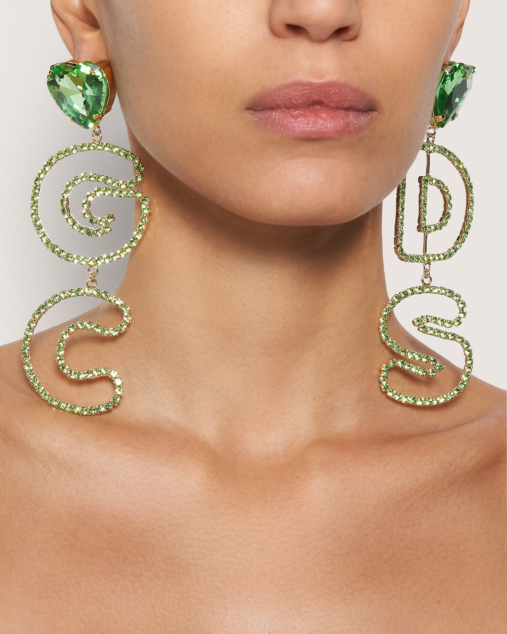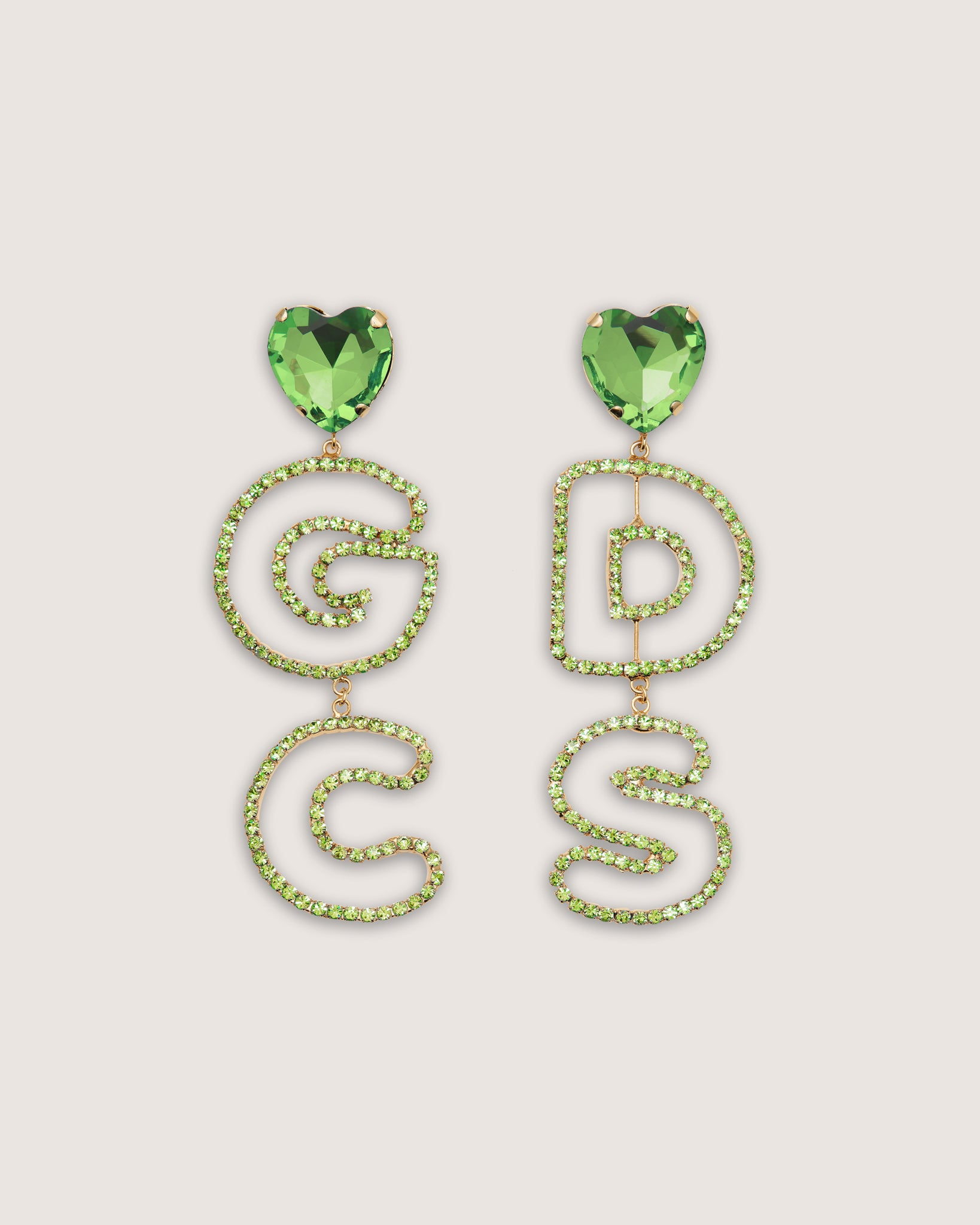 Maxi GCDS earrings with Preciosa crystal heart and GCDS Cute logo.