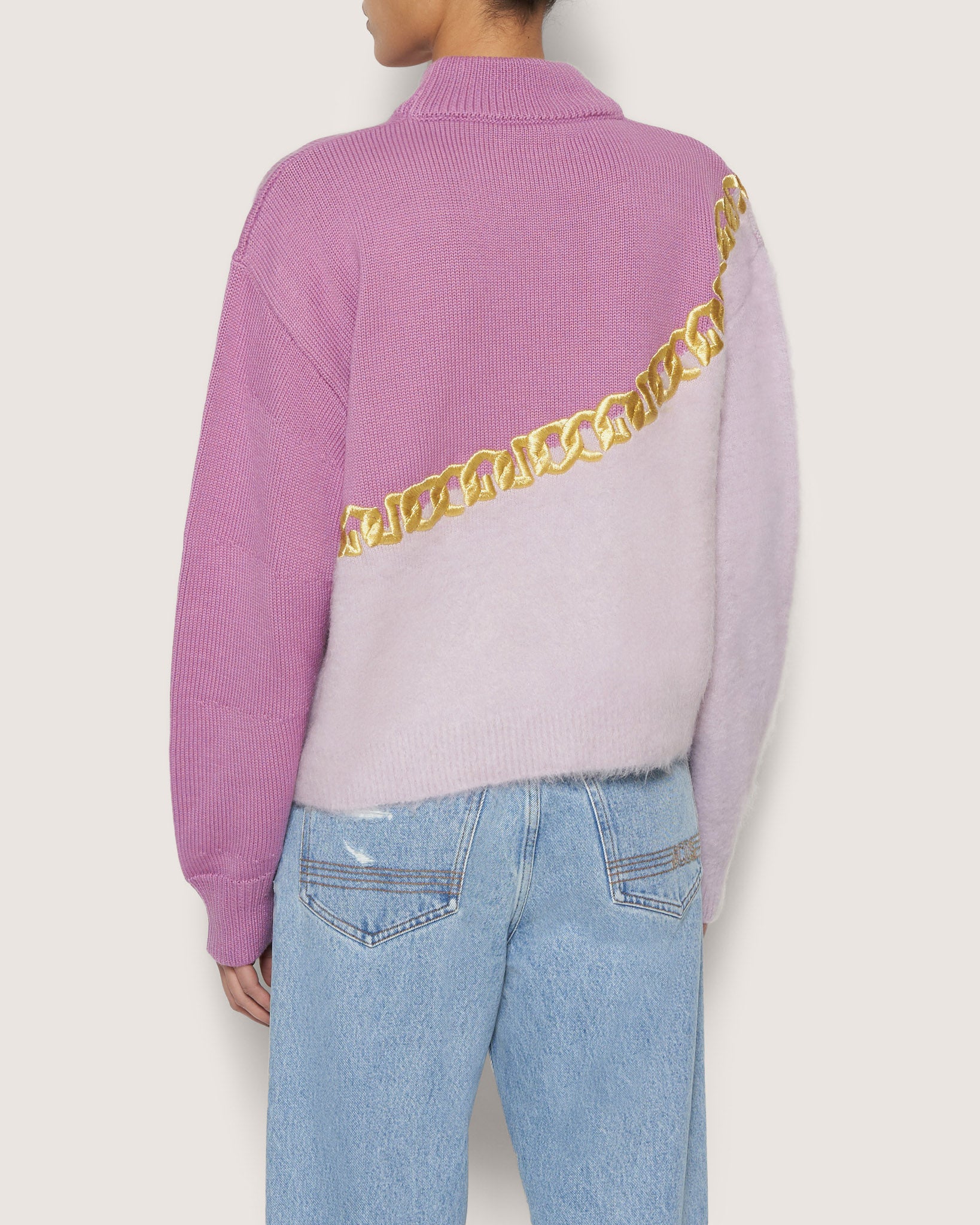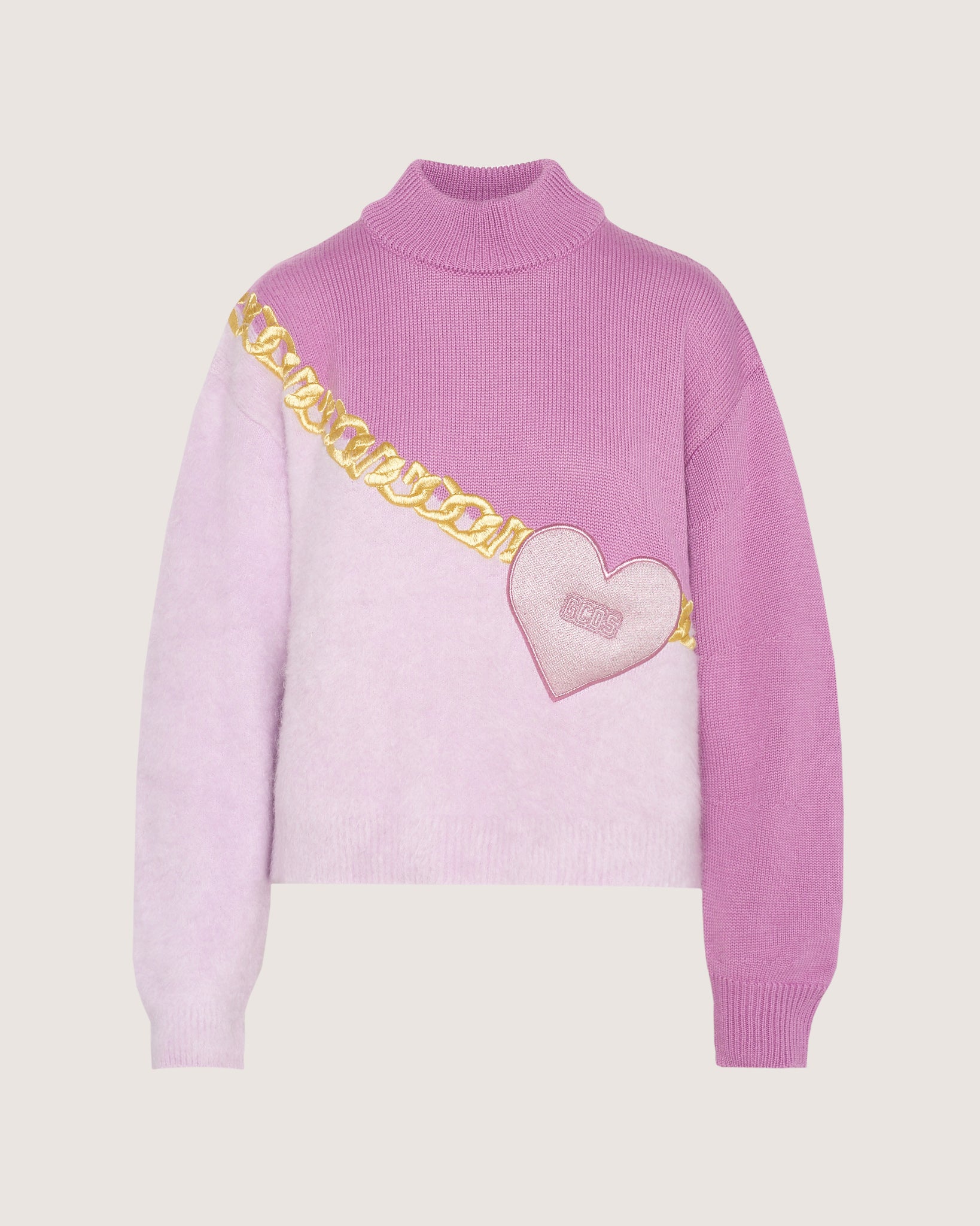 Soft mohair jersey GCDS sweater, semi-high collar. The two knits are divided by a maxi GCDS logo chain with iconic Musa Heart bag made of lurex jersey knit.