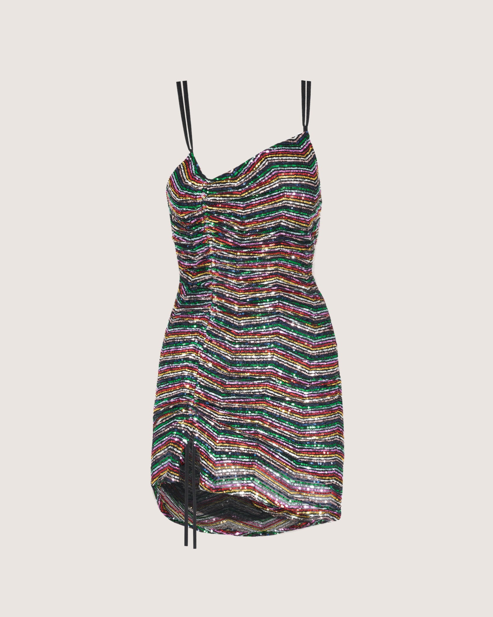 Asymmetrical GCDS sheath dress, in full sequin zig-zag design, with cord tie along the entire length, from the right breast to the thigh slit. Double shoulder straps.