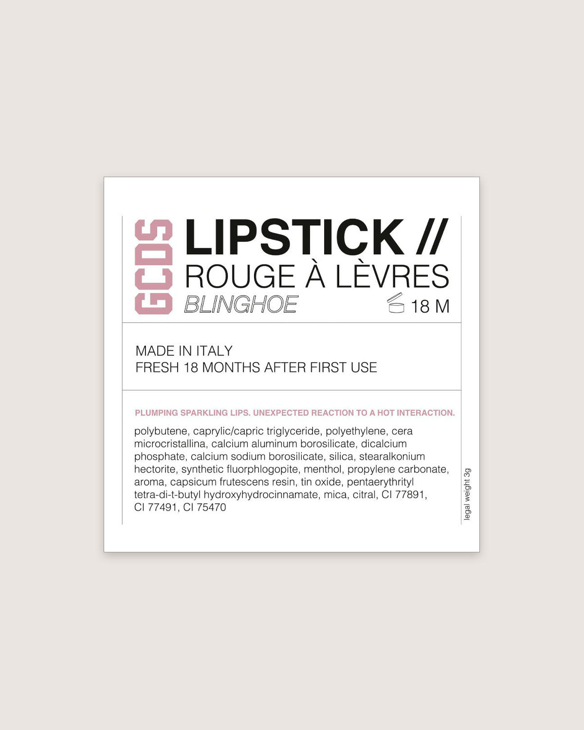 Sparkling pink lipstick with plumping effect.