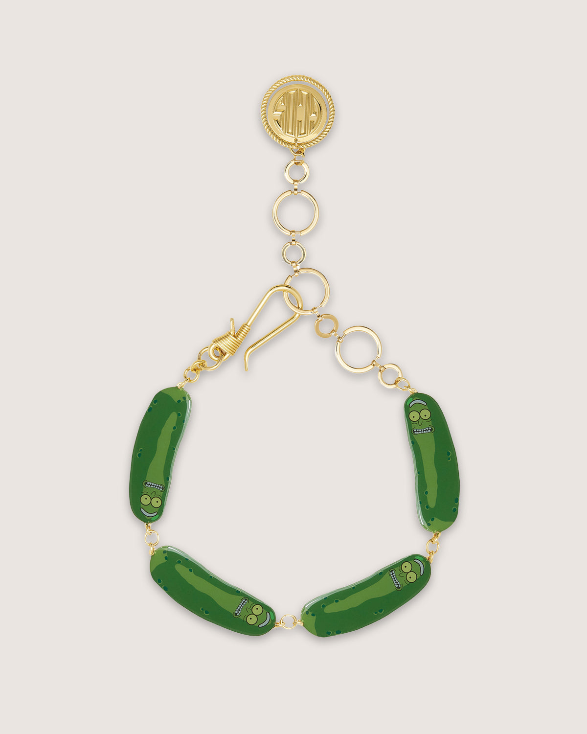 Pickle Rick repeat pendant necklace, hand mounted with hook and loop closure. Adjustable length.