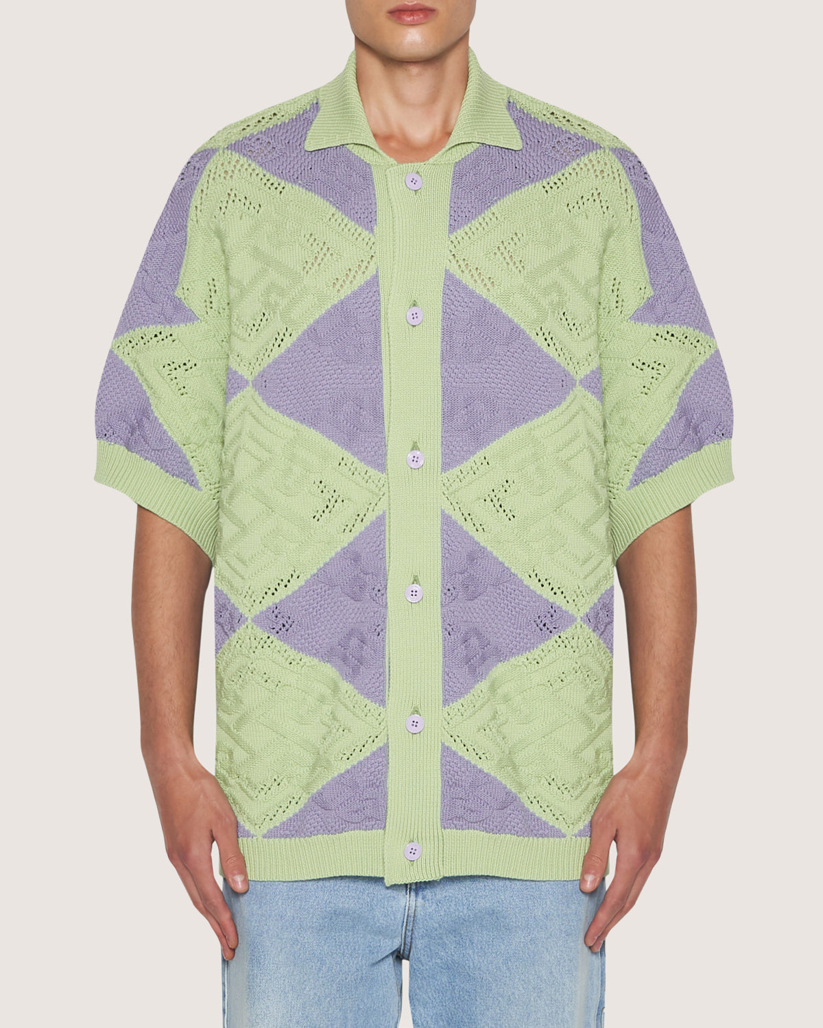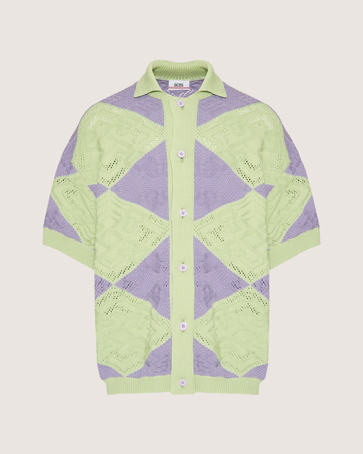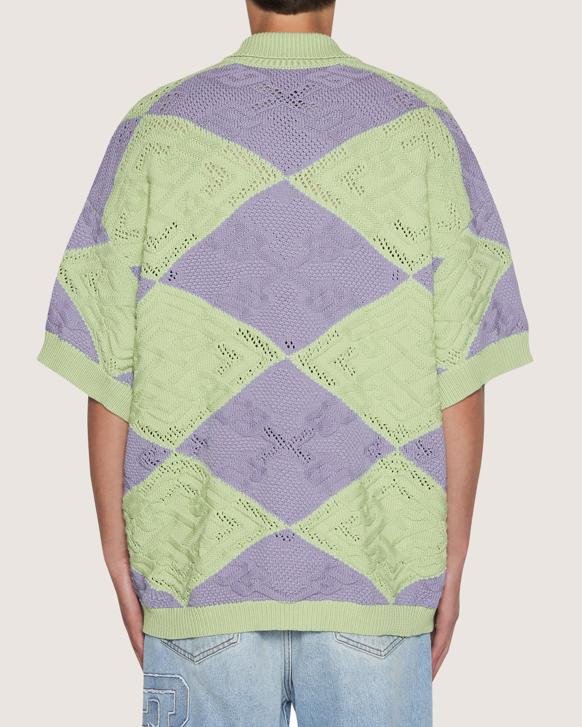 Crochet oversized polo shirt with perforated logo pattern in two colors.