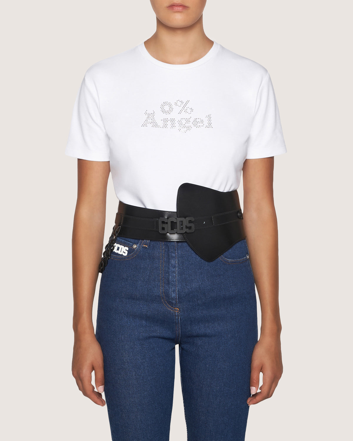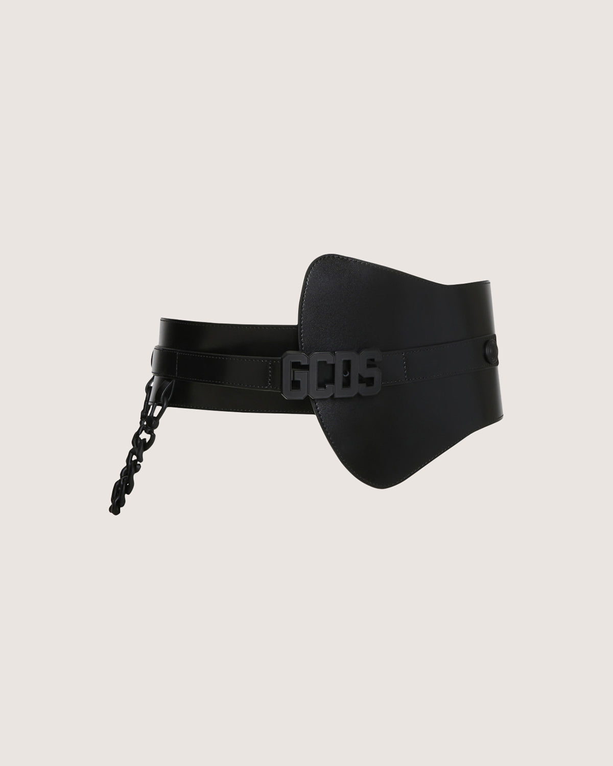 Asymmetrical leather belt with removable chain on right side and wearable at the waist.