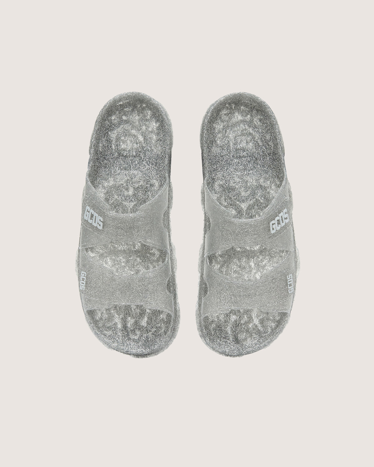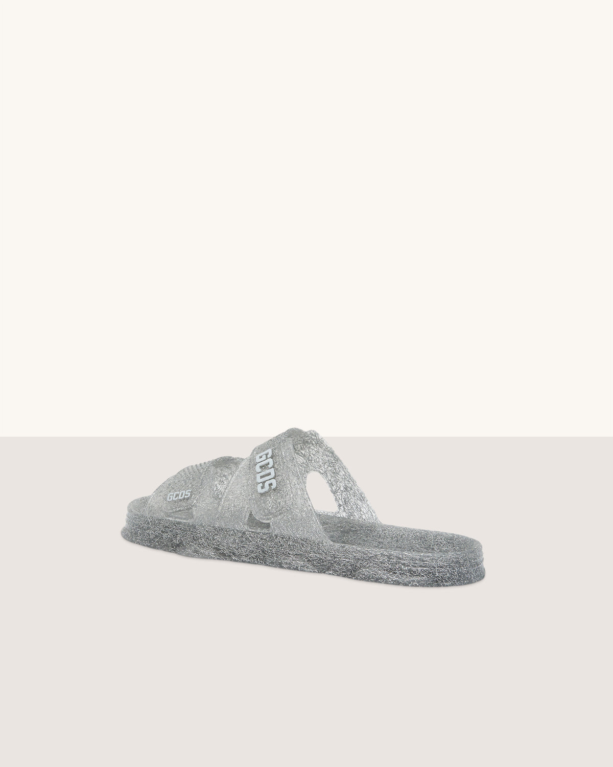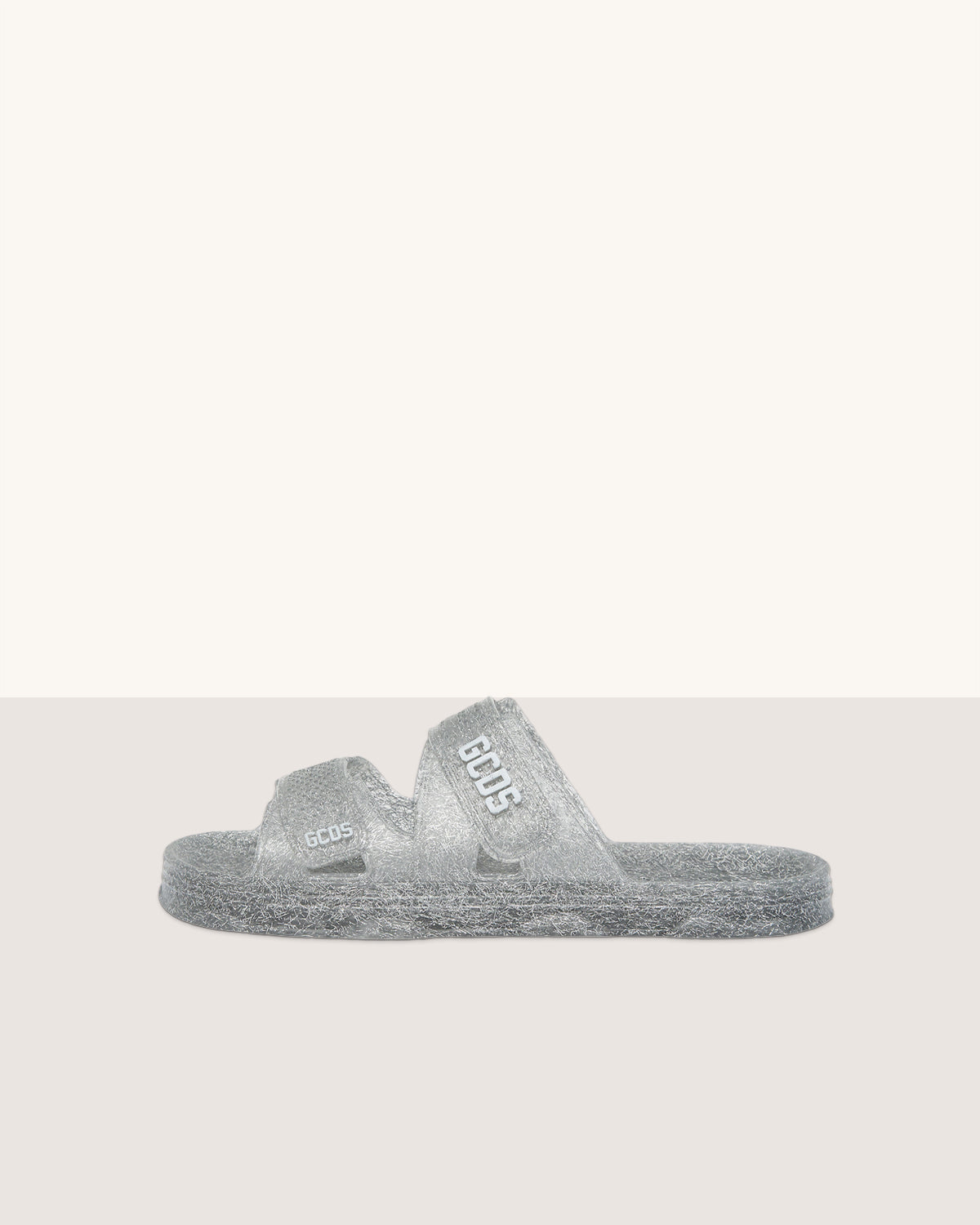 Rubber sandal slider with glitter and GCDS logo. Non-adjustable straps.