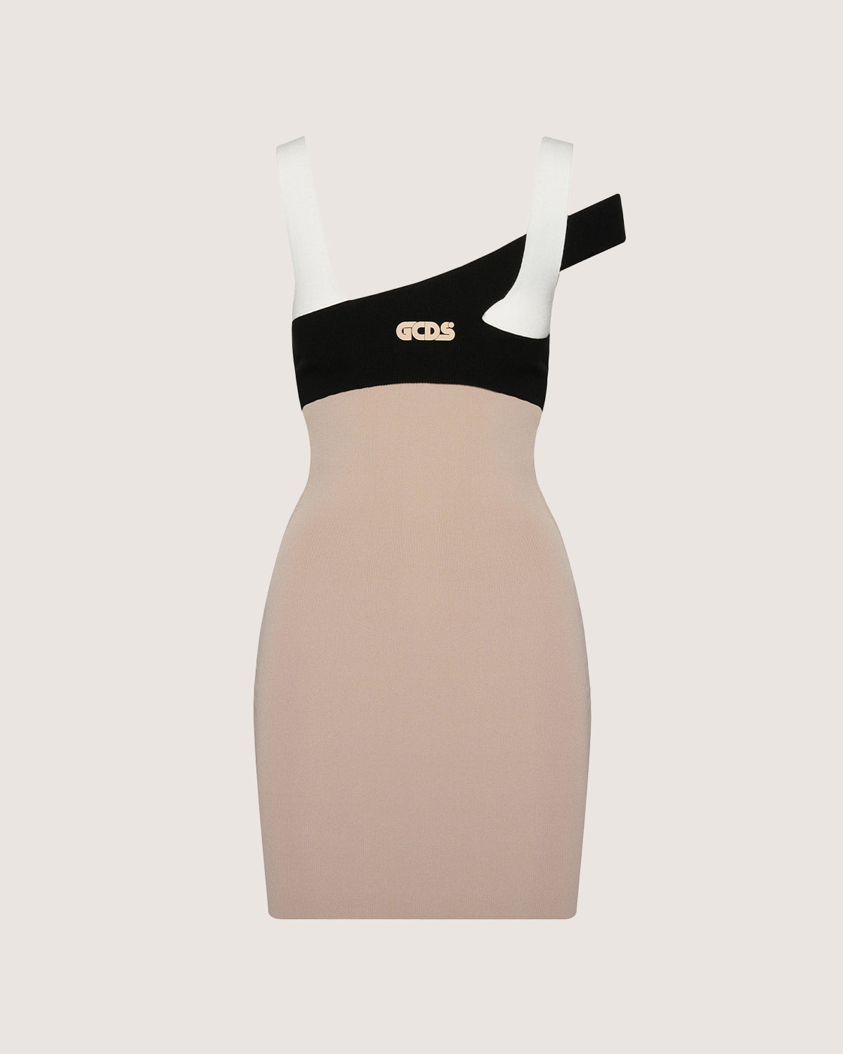 Plain knit sheath dress, characterized by an overlapping of layers of different colors at the neckline. Rubberized GCDS logo patch applied on the center front.