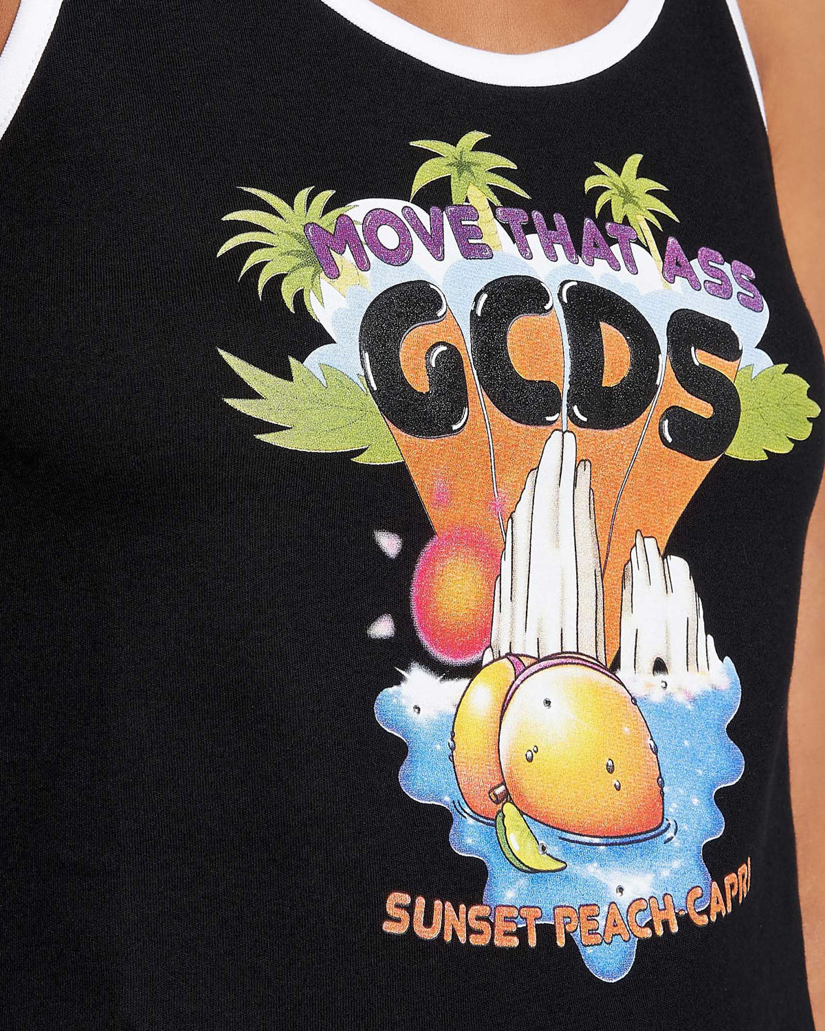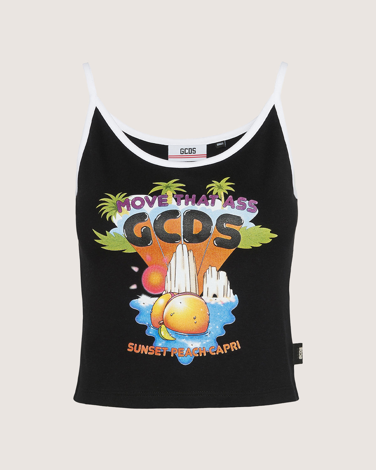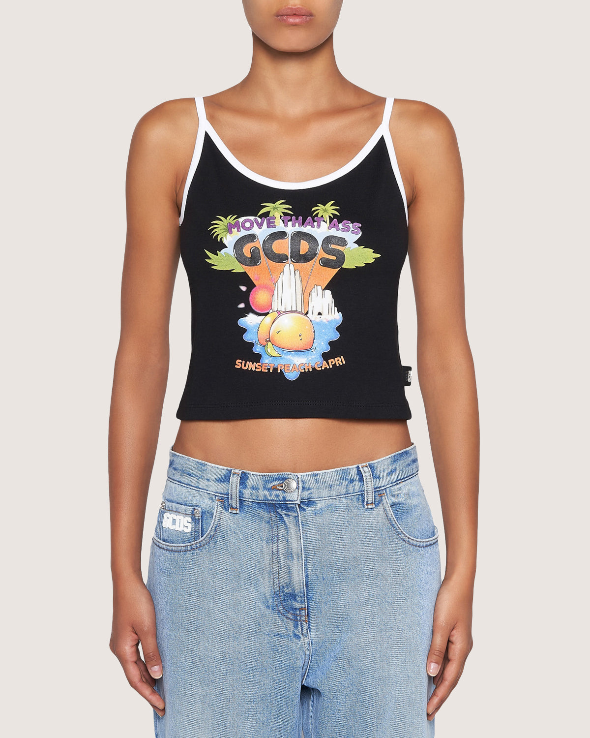 Cotton top with graphic print on the front and contrasting shoulder straps.