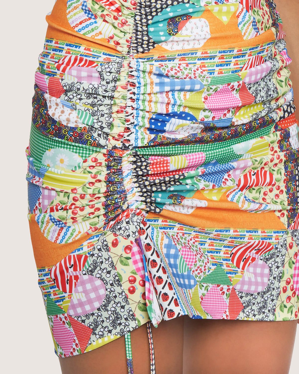Mini skirt in printed lycra. Adjustable drawstring on the right side. Invisible zipper on the side.