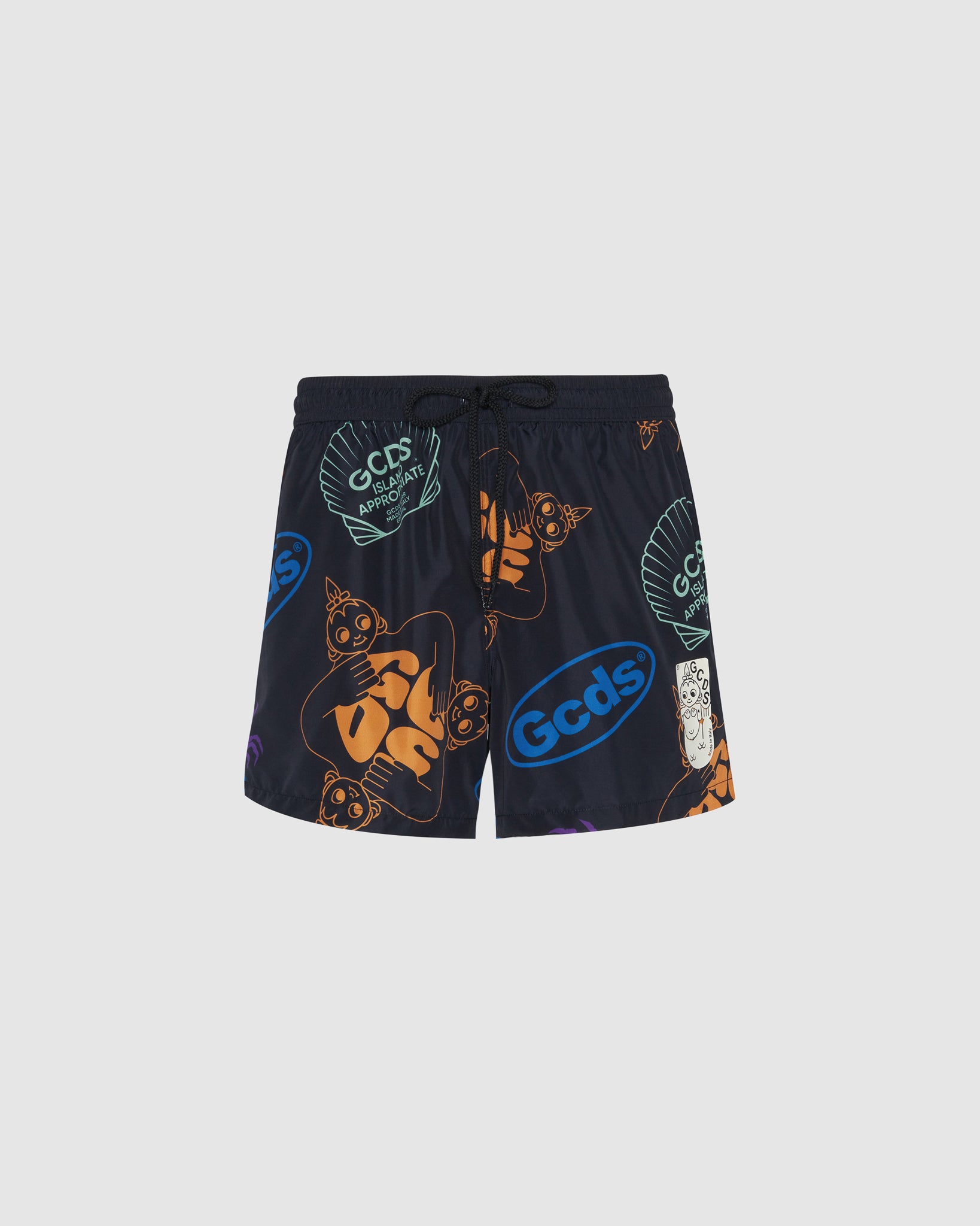 Nylon GCDS swim shorts with all-over Shell motif print and silicone Mermaid patch on the left leg. Welt pockets. Elastic waistband and drawstring. Rear Velcro pocket.
