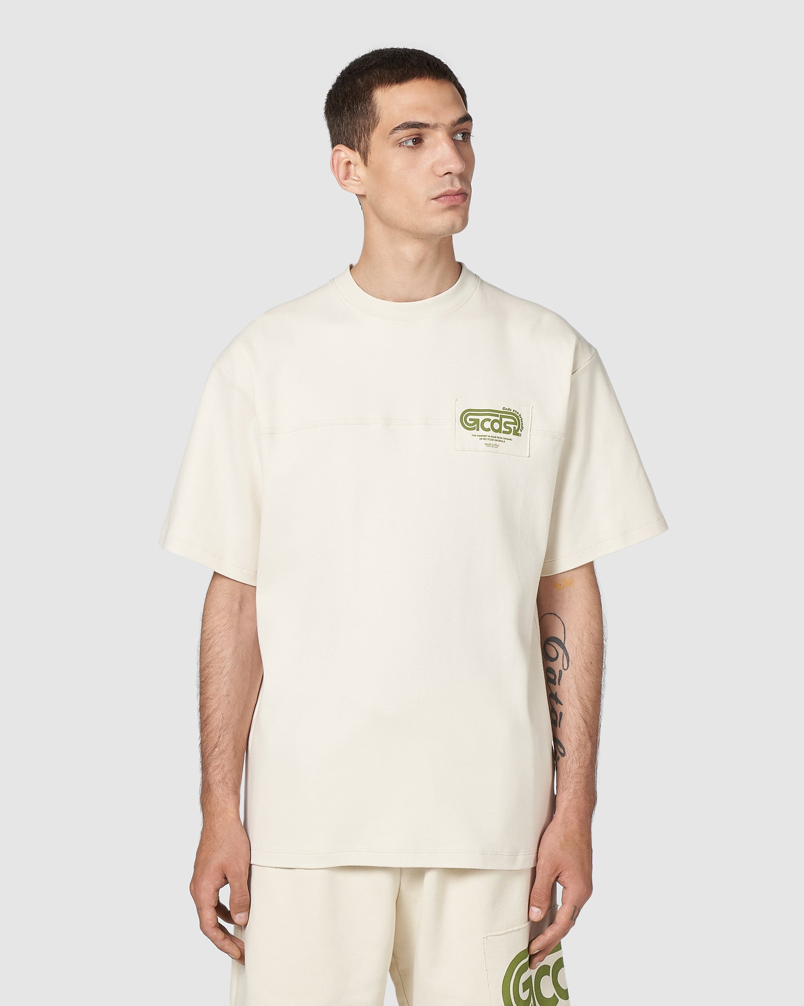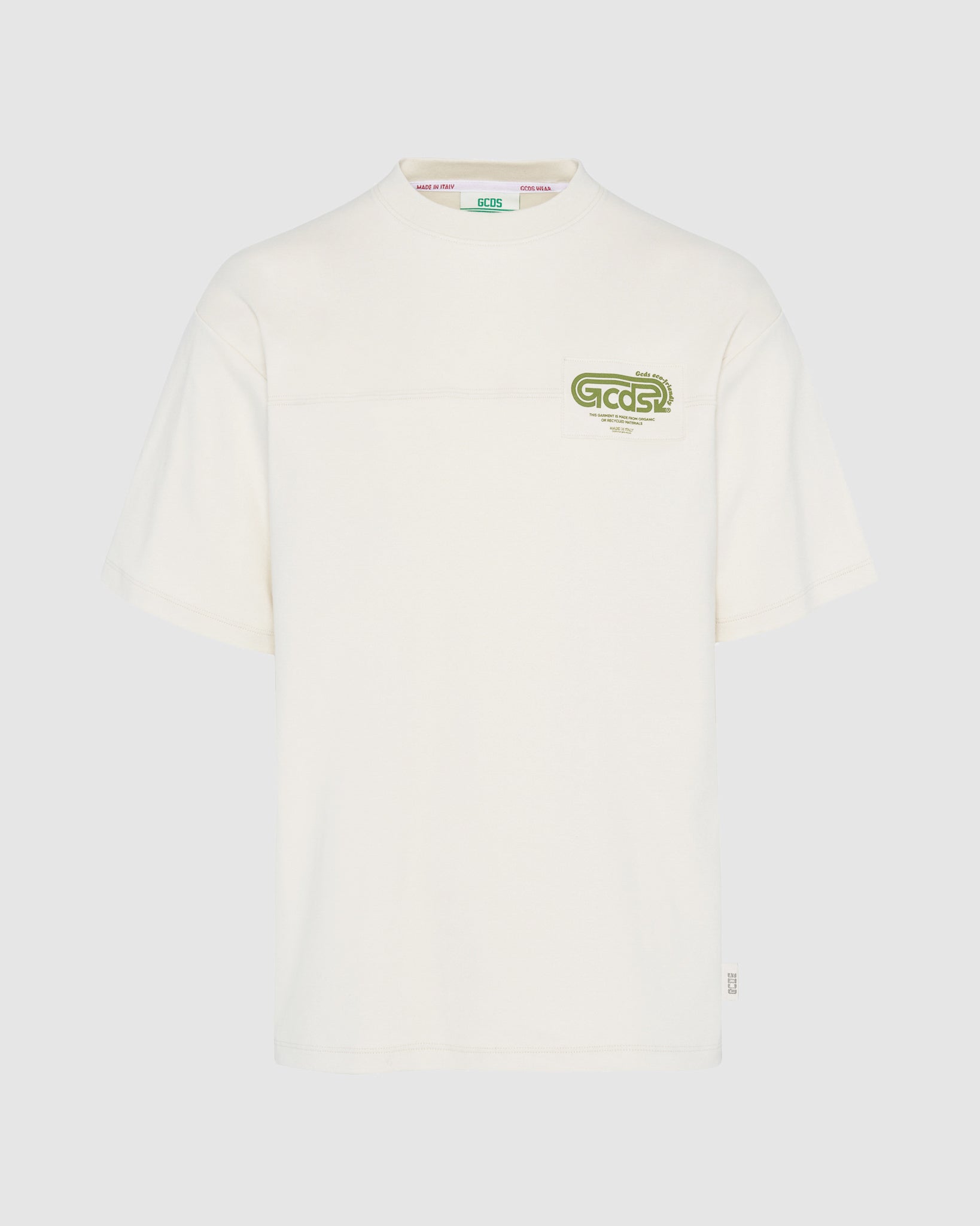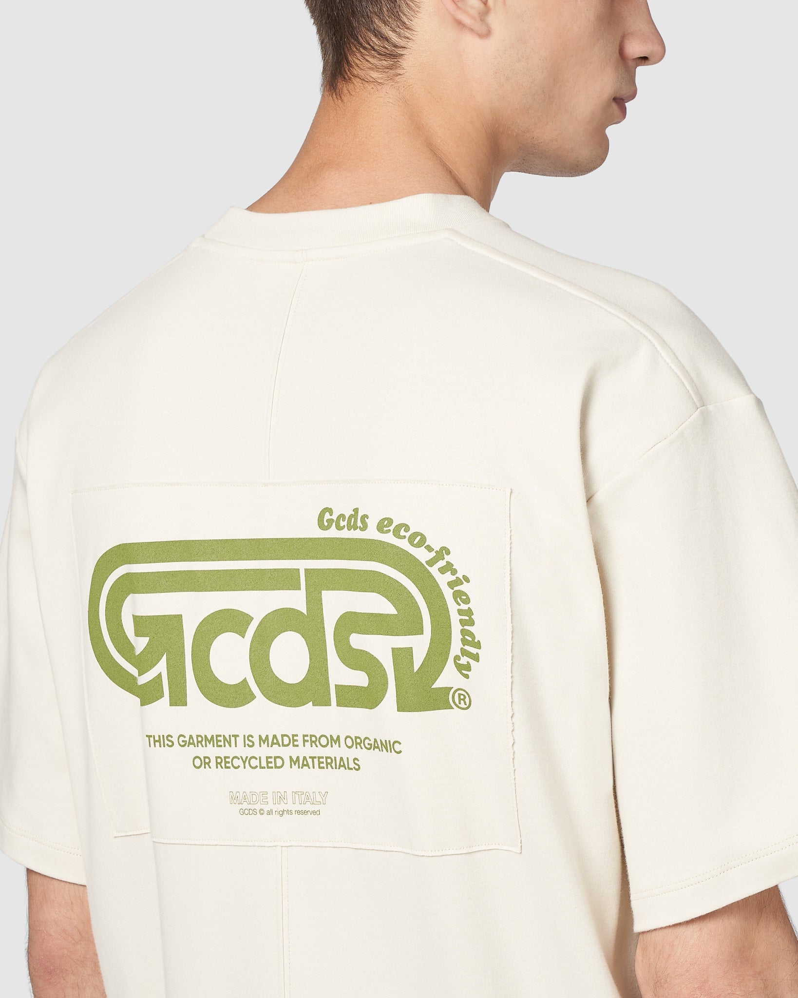 Organic cotton GCDS T-shirt, horizontal cut on the front and new GCDS Eco-friendly logo fabric patch at pocket level. On the back, vertical cut with maxi fabric patch and Eco-friendly logo. Regular fit.