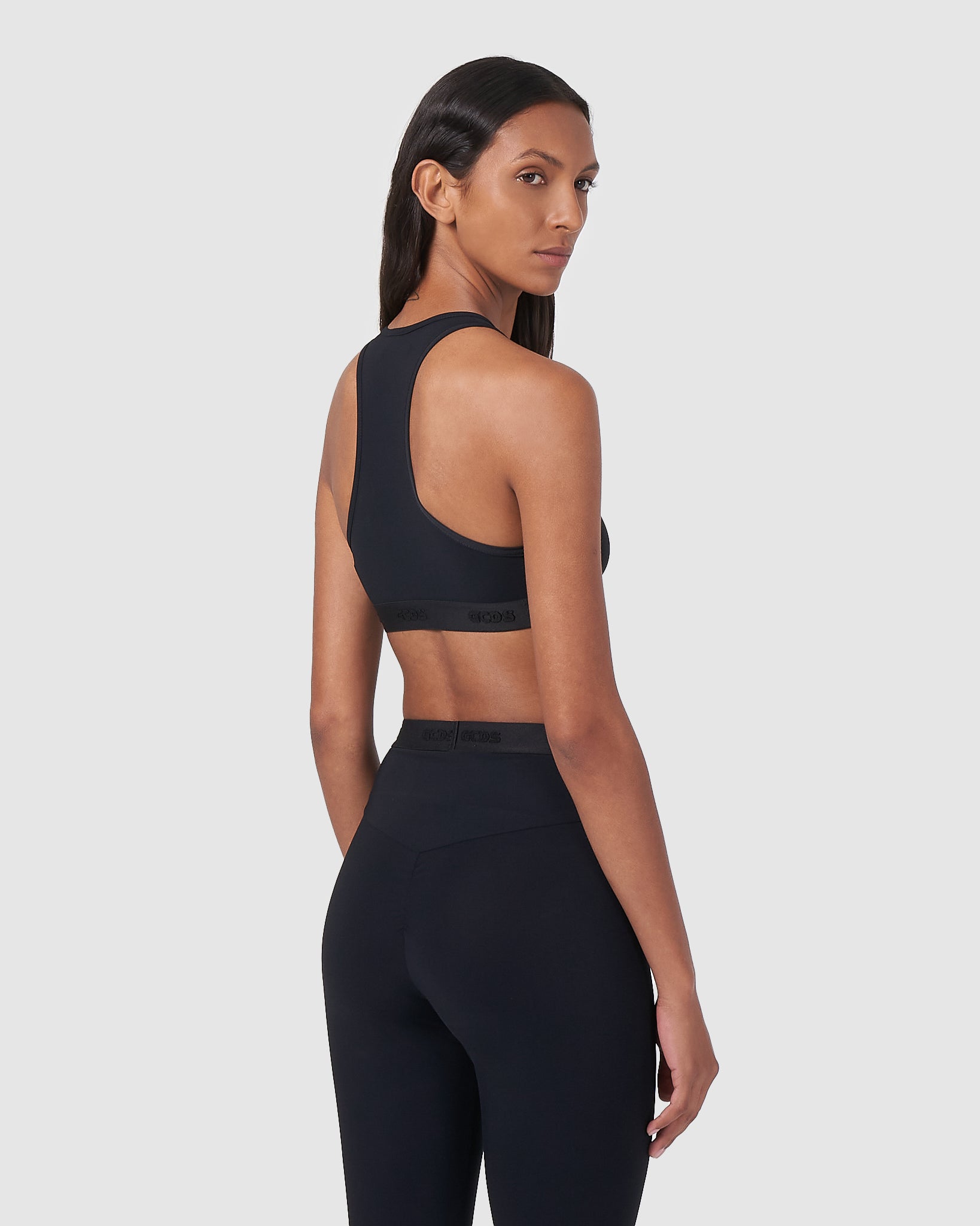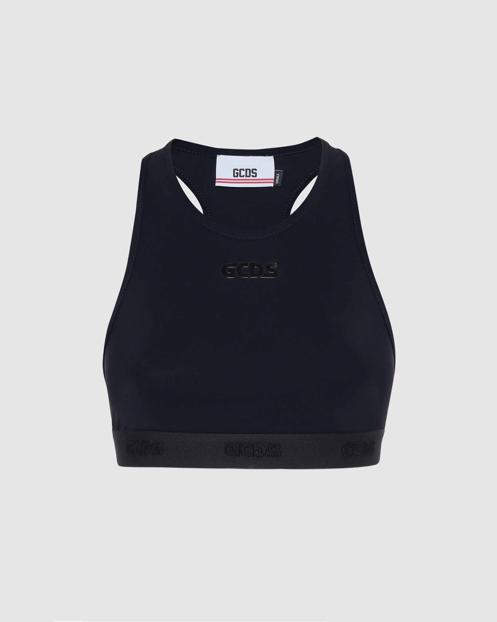 GCDS Lycra sports top with racer back for greater freedom of movement. Elastic logo on the bottom. On the center front, matching wet effect GCDS logo print.
