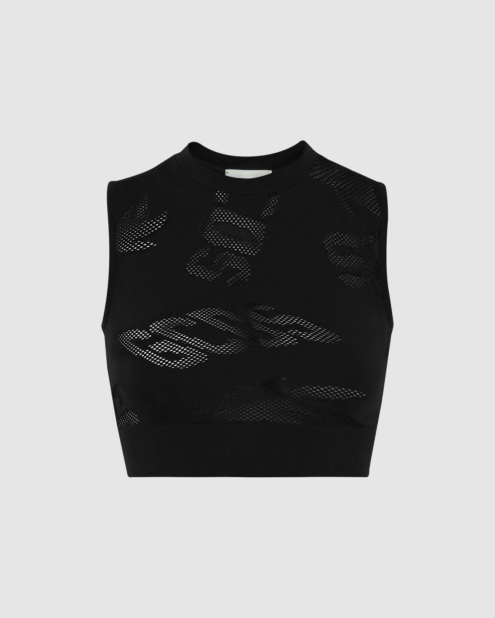 GCDS crew neck recycled stretch polyester sleeveless crop top. Logo pattern and marijuana leaf mesh motif. Made using the seamless technique.