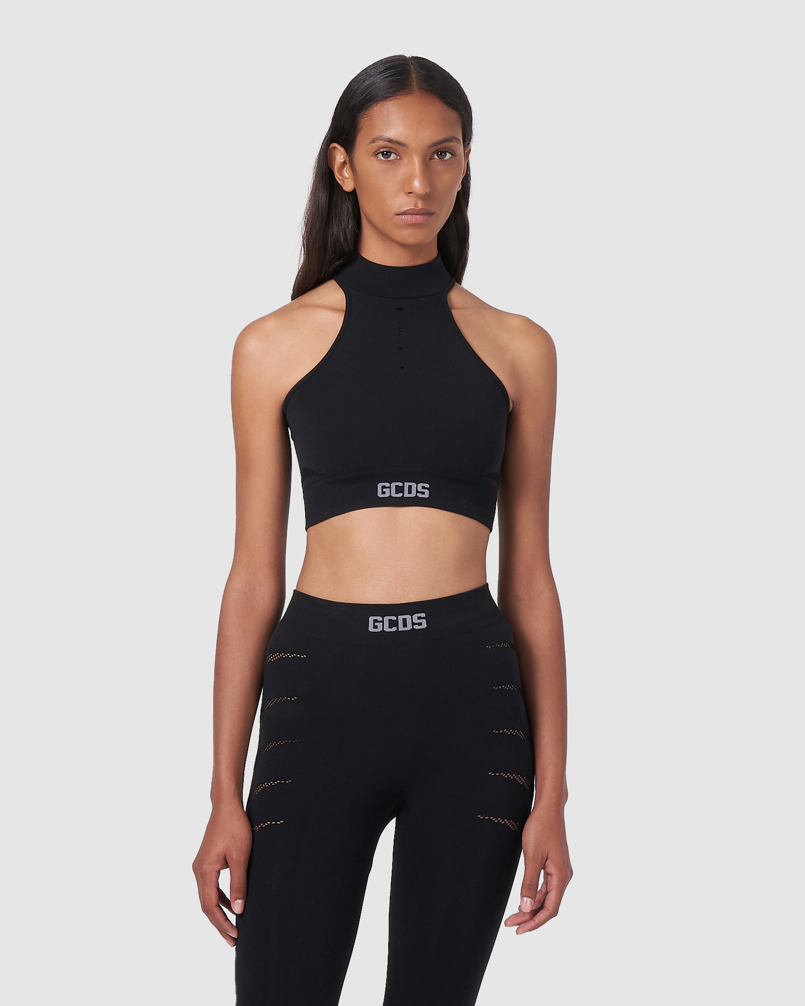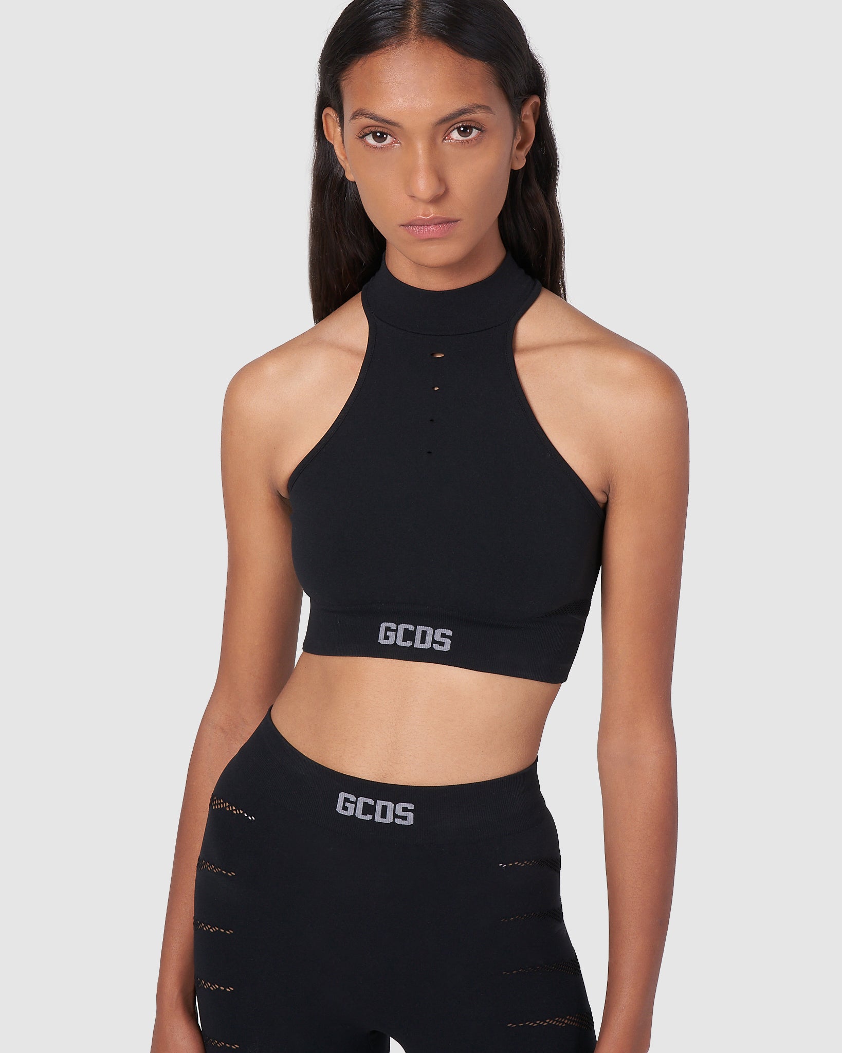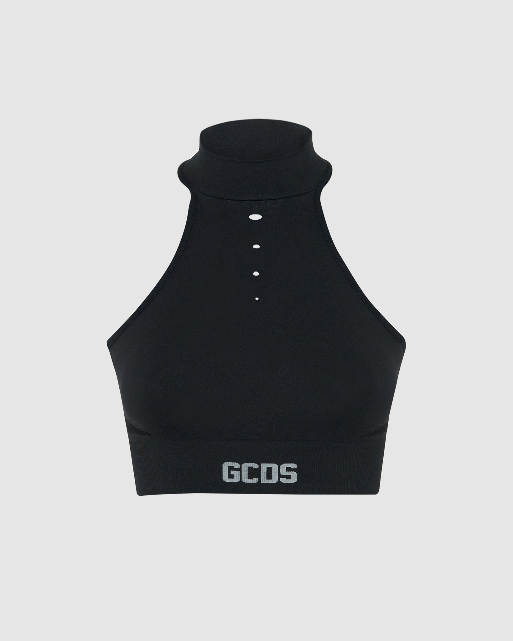GCDS recycled polyester top with halter and high neck. On the center front, holes of different sizes. On the back, holes and mesh detail on the center and sides. Elasticated bottom with contrasting logo on the center front. Made using the seamless technique.