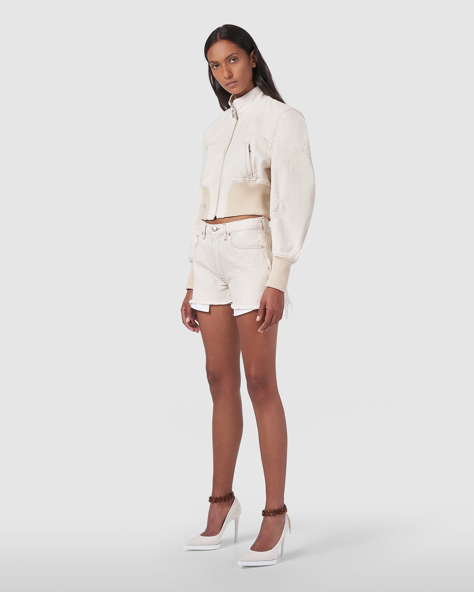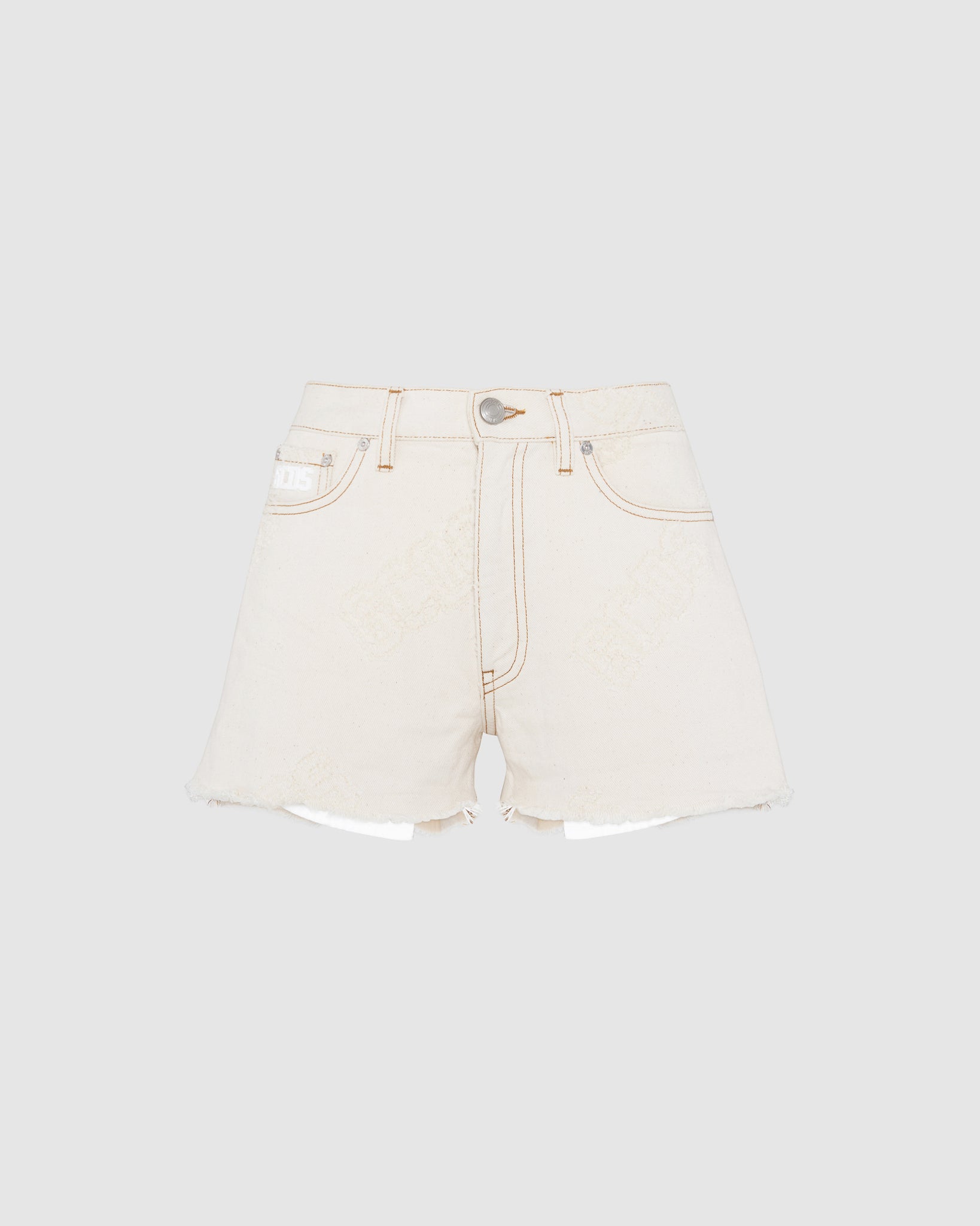 High-waisted GCDS denim shorts with bouclé effect laser logo. Raw-cut at the bottom with contrasting tobacco-colored topstitching. Visible pocket lining.