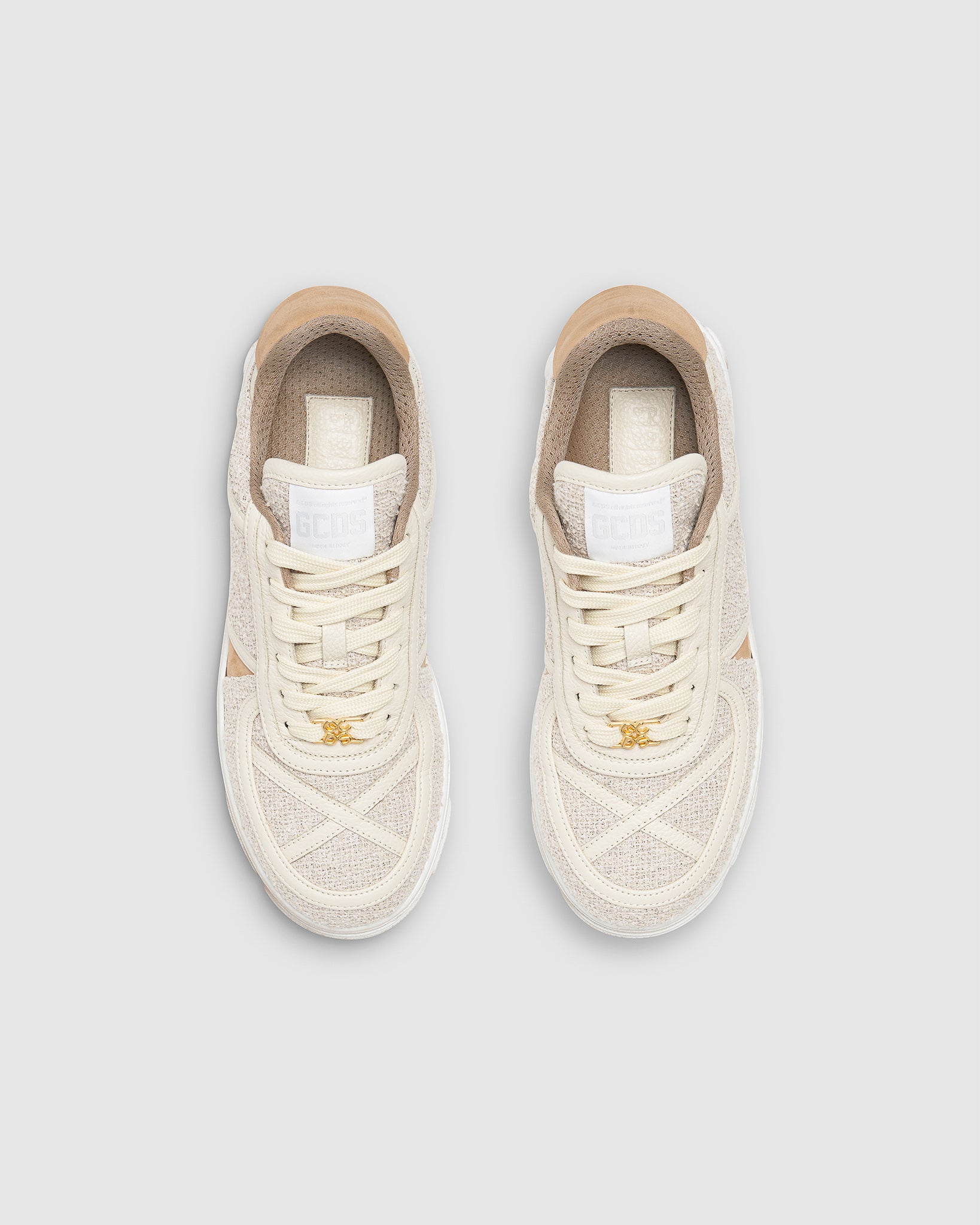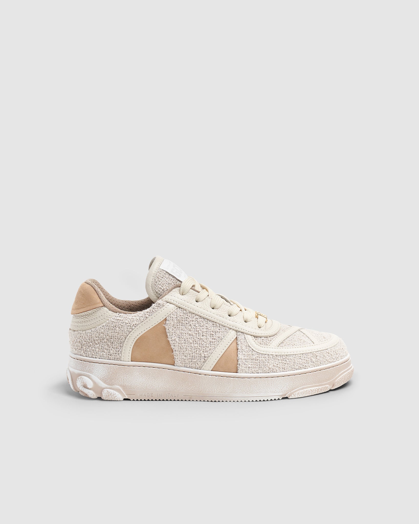 Basketball-inspired GCDS sneakers with a sports aesthetic. Bouclé, nubuck and calfskin leather vamp characterized by prominent matching leather cuts and seams. Toebox with matching leather X. Nami box sole in the classic wave shape with logo on the outsole. Matching laces and Andy logo deubré. Distressed effect sole.