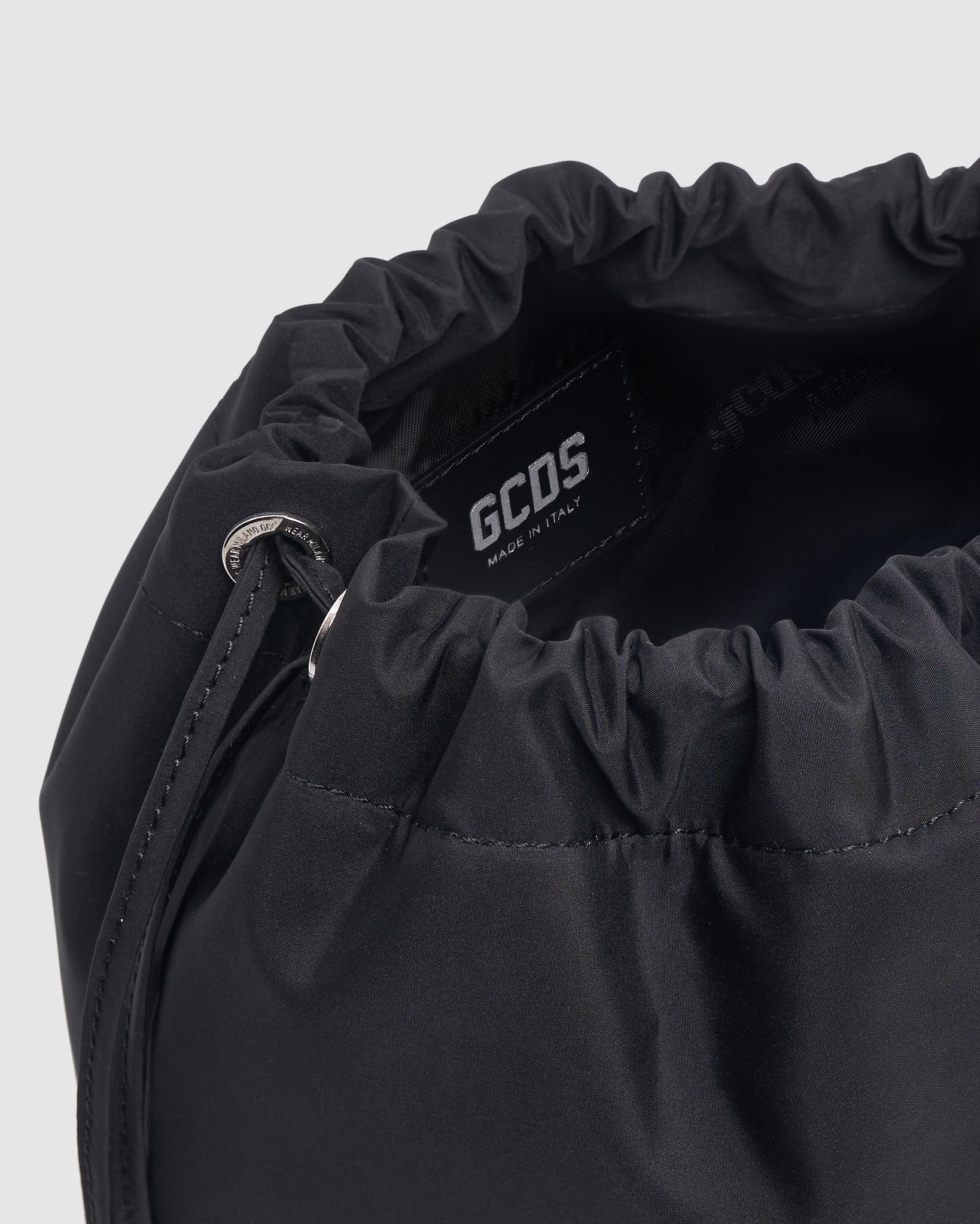 GCDS nylon mini bag with adjustable cord tie, matching leather turn-ins and cord tie pull. Polished nickel logo plate on the center front. On the inside, jacquard logo lining and leather patch with heat-embossed logo.
