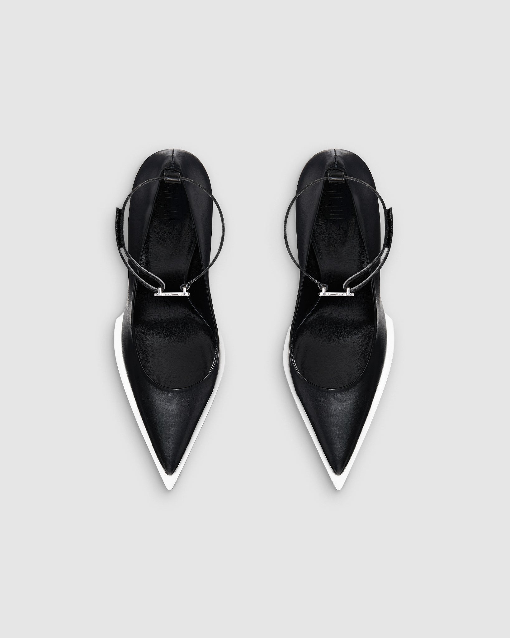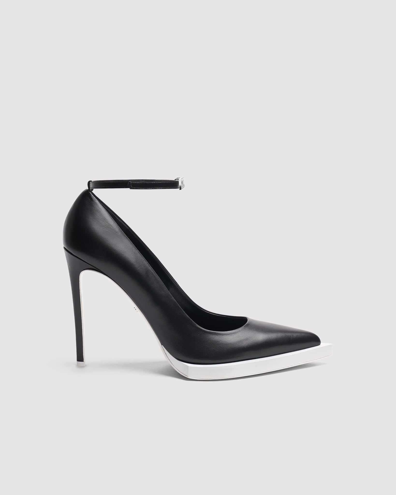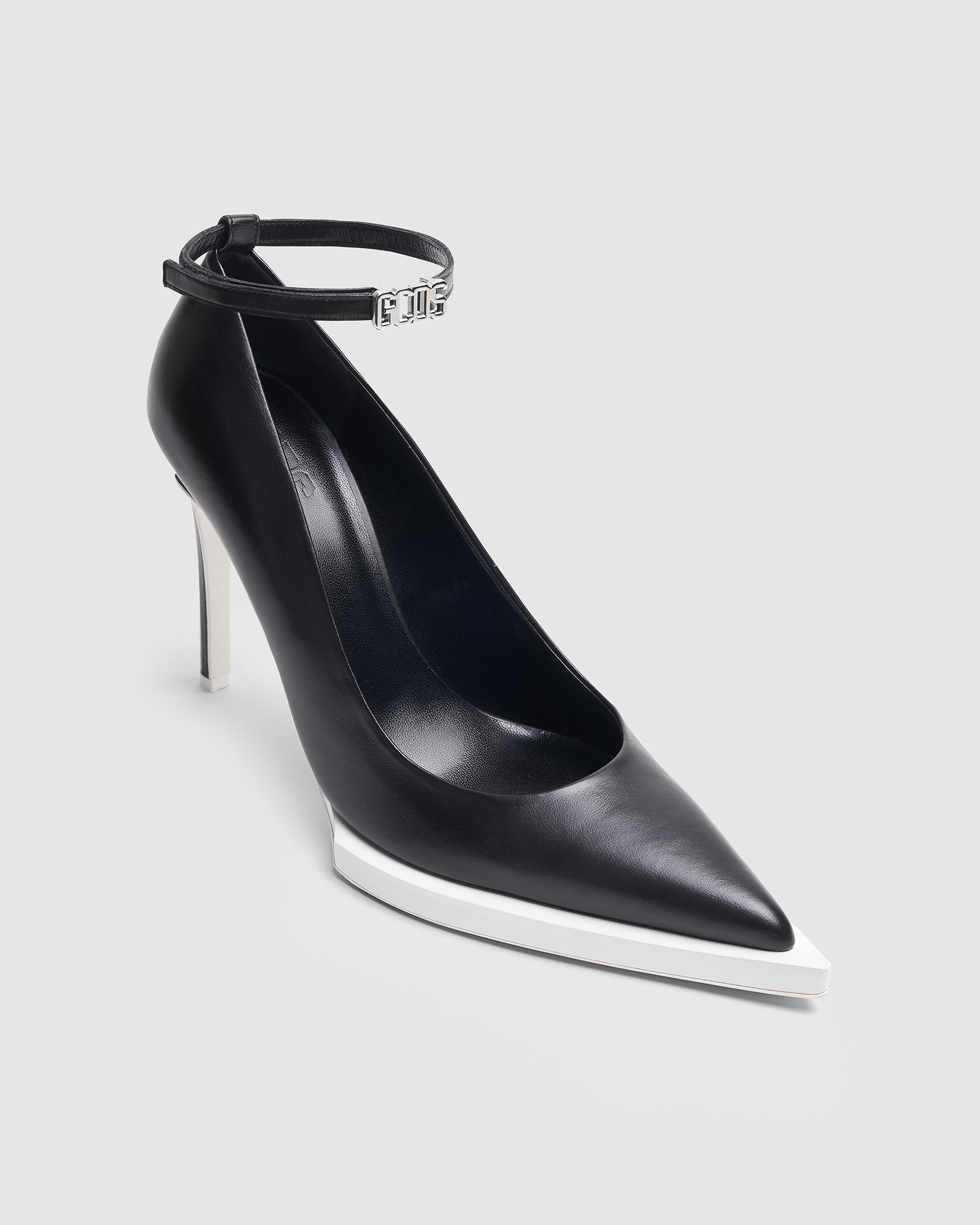 GCDS leather pumps with stiletto heel characterized by a protruding platform to accentuate the shape of the toe. Ankle strap with polished nickel logo and velcro closure.