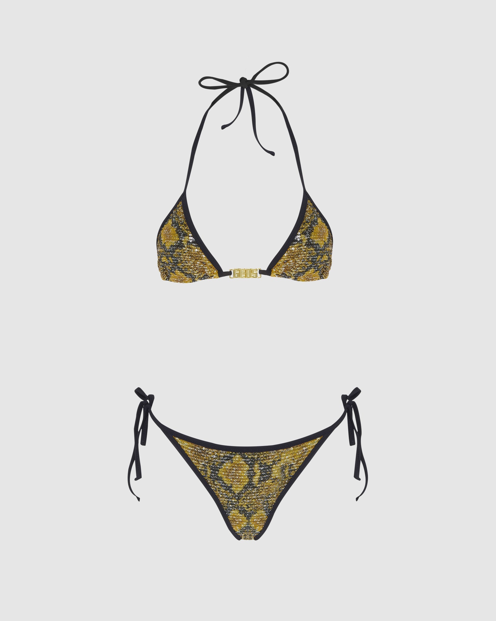 GCDS sequined triangle bikini with python print and contrasting trim. Adjustable clasp. Functioning golden logo clip at the center front. Regular panties with laces.
